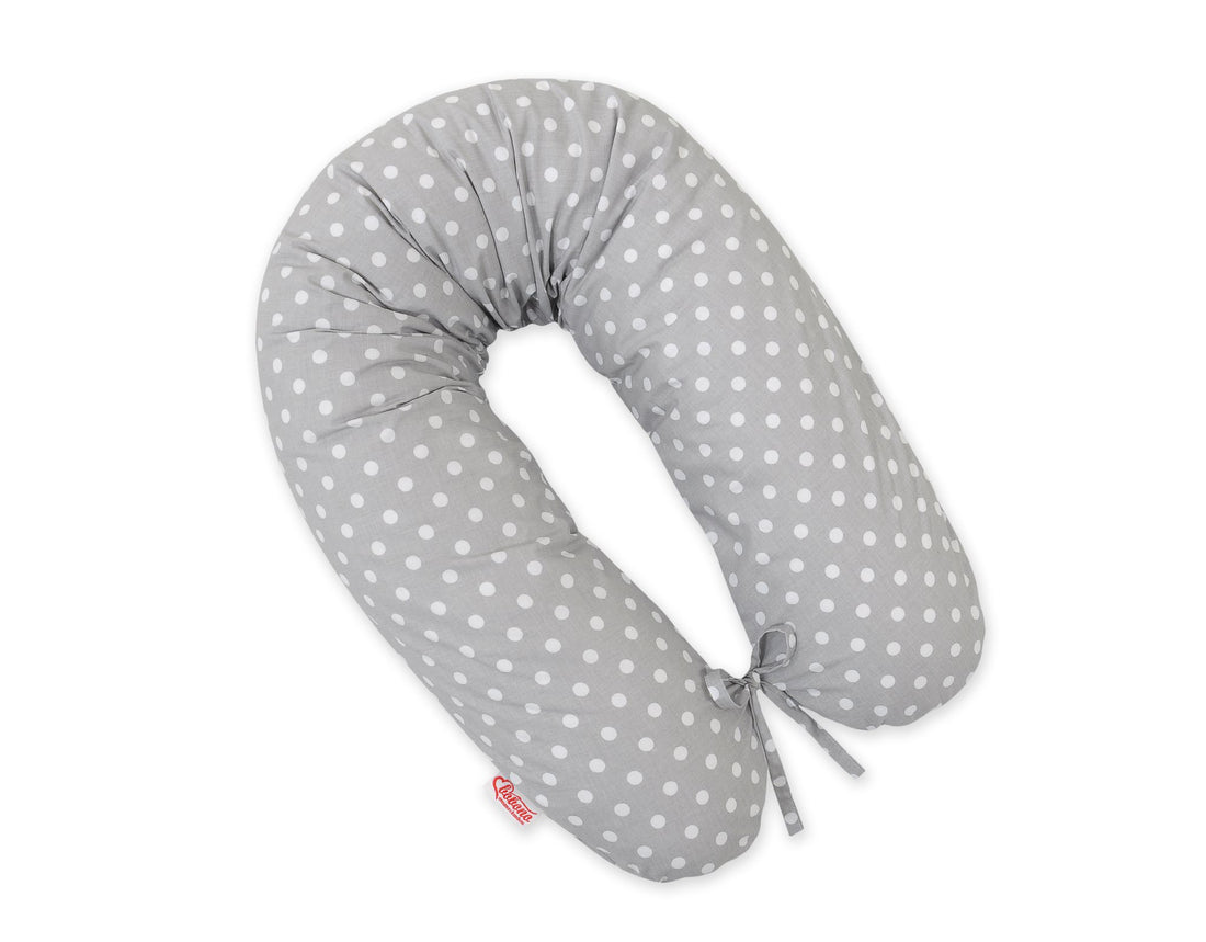 Zwangerschapshulp kussen – Langere uitvoering met afneembare hoes Design: Witte stippen op grijze achtergrond Het...