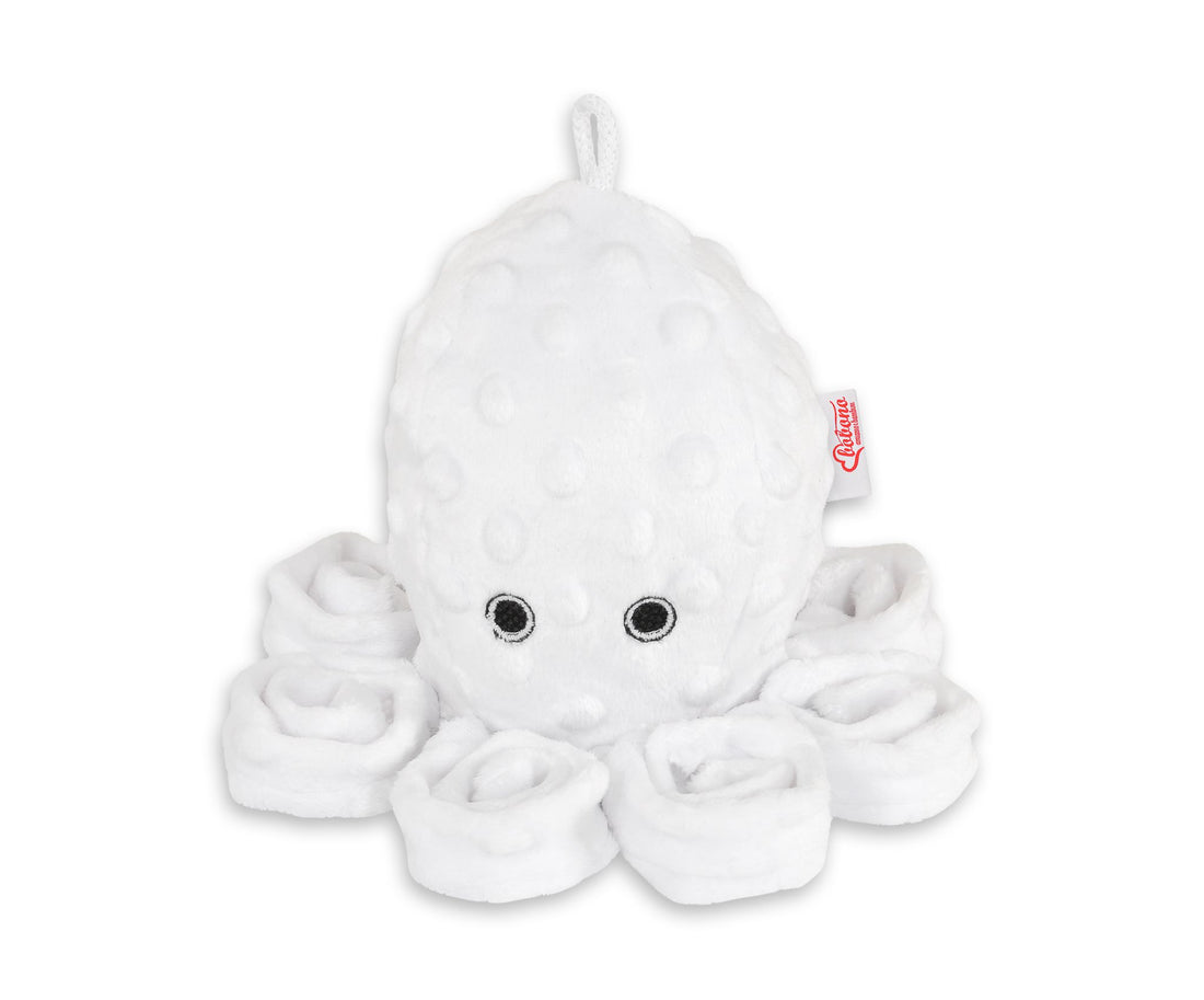 Zachte octopus knuffel – rammelaar – minky fleece – veilig voor baby's – wit met stipjes
