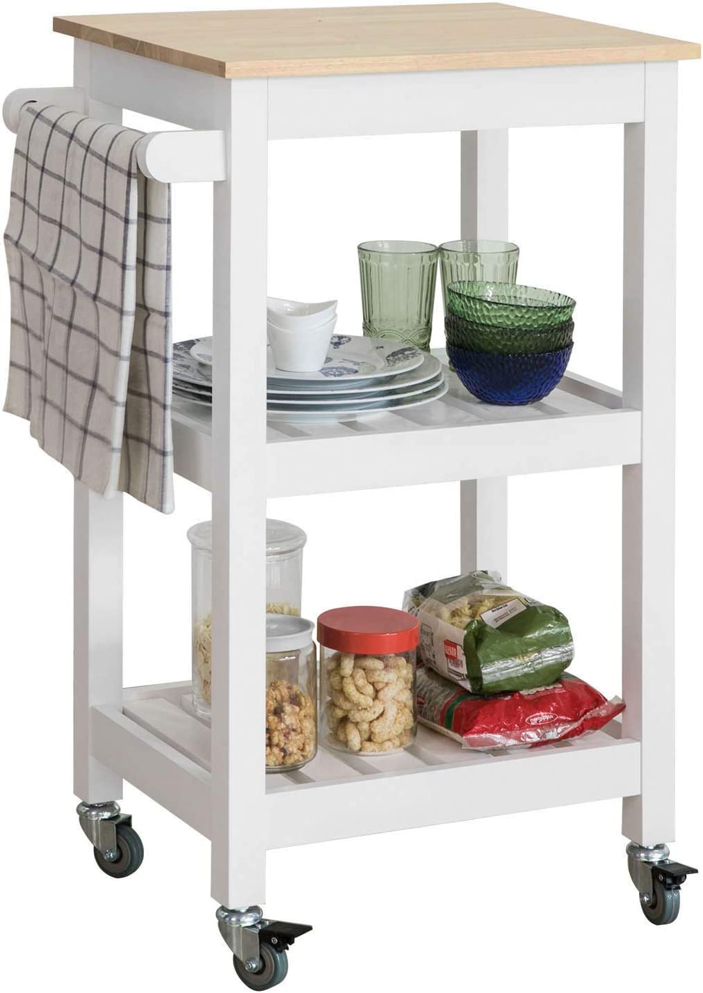 Keukenopbergwagen Serveerwagen Keukenplank met rubberen houten blad, 2 planken