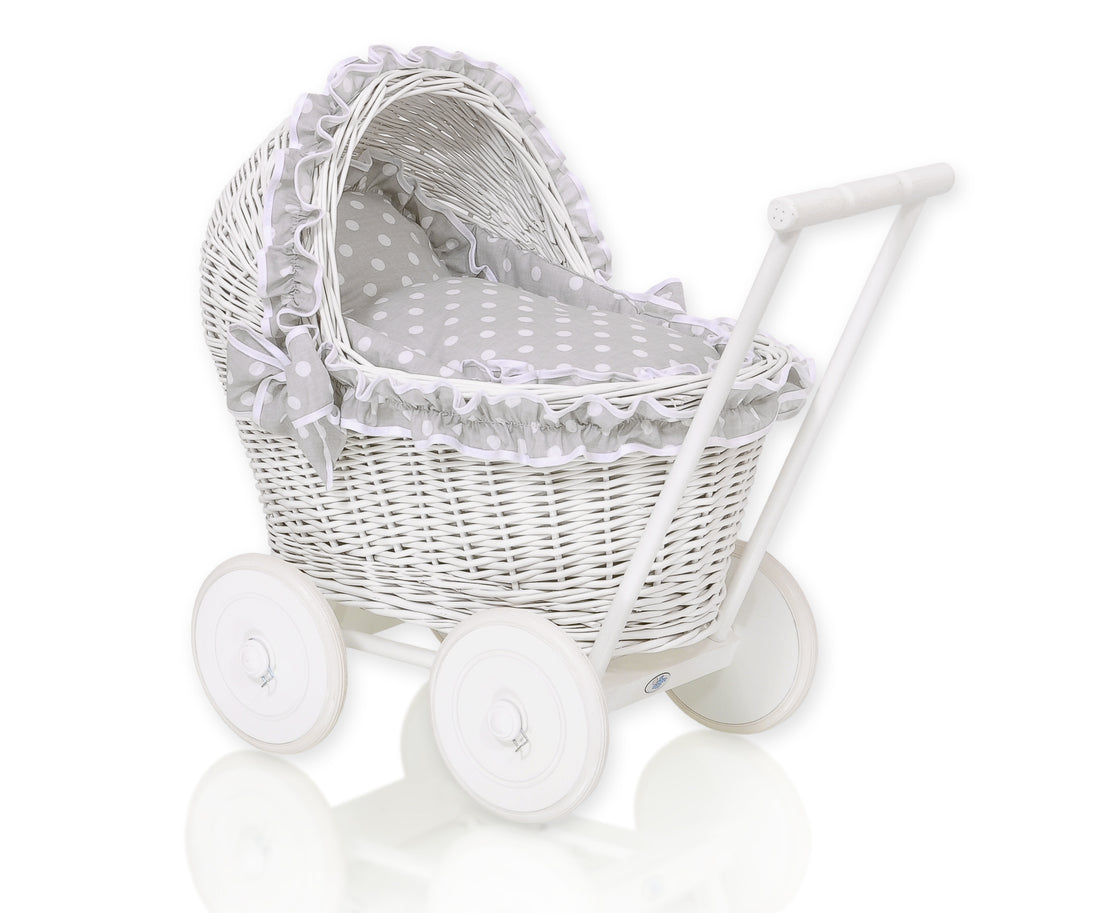 Weißer Puppenwagen aus Weide – Spielzeugwagen – mit weicher Füllung und grauer Bettwäsche