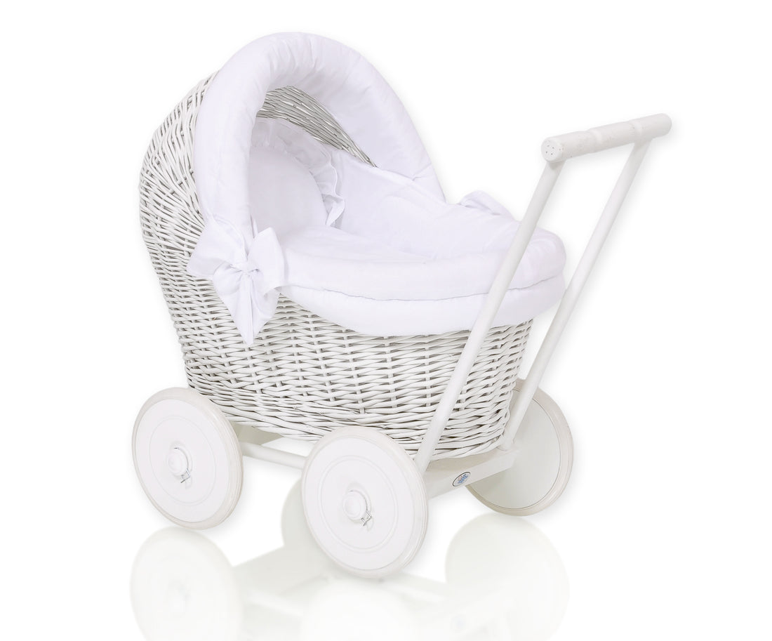 Weißer Puppenwagen aus Weide – Spielwagen – weiches Futter & stabiles Holzgestell