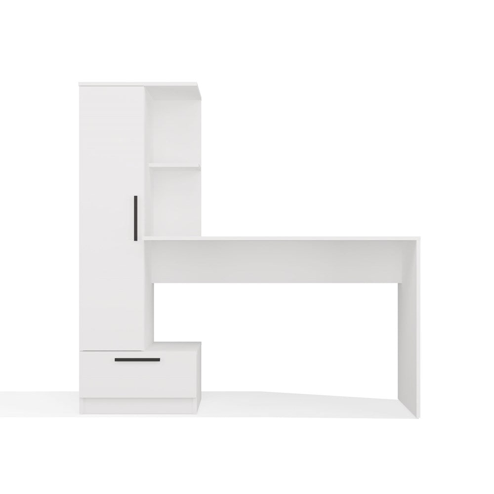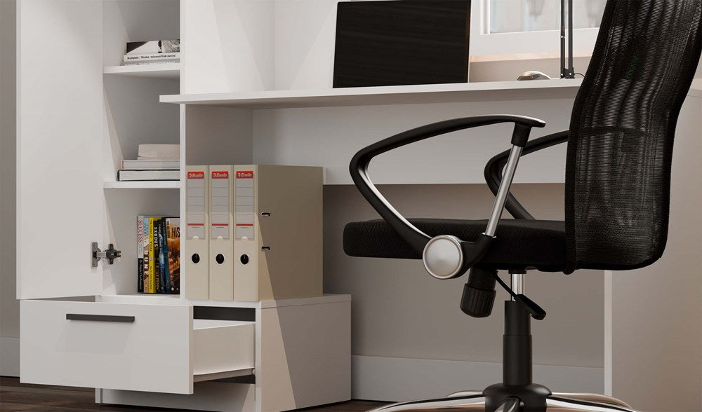 Het COSMO bureau met plank is dé ideale 2-in-1 oplossing voor wie zoekt naar een stijlvolle, compacte werkplek met slimme opbergruimte. Het moderne, minimalistische design in mat wit past moeiteloos in iedere tienerkamer, thuiskantoor of studio. De geïntegreerde plank, voorzien van afgesloten en open vakken, biedt volop ruimte voor boeken, documenten en accessoires. Een ruime lade en een breed werkblad zorgen ervoor dat comfort en orde hand in hand gaan tijdens het werken of studeren.