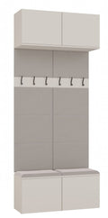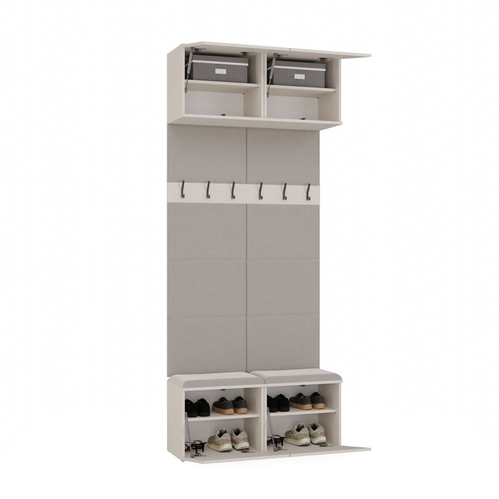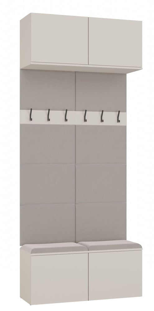 De DEN HAAG II 2W is een moderne, dubbele halhanger/garderobe uit de modulaire HAGA-serie. Dit compacte meubelstuk in elegante kasjmier kleur combineert twee onderkastjes met comfortabele zitplaatsen, twee gestoffeerde hangpanelen met handige zwarte haken én twee ruime bovenkasten. Het minimalistische, greeploze TIP-ON systeem en de hoogwaardige afwerking zorgen voor directe toegankelijkheid, overzicht en eigentijdse uitstraling. Ideaal voor het netjes opbergen van jassen, schoenen en accessoires, en daarbij ontworpen om perfect te passen in zowel grote als kleinere entrees.