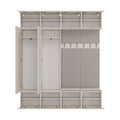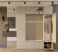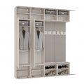 Deze garderobeset is bij uitstek geschikt voor grotere entrees in zowel appartementen als eengezinswoningen. Door het modulaire ontwerp kunnen elementen naar wens worden gecombineerd of uitgebreid, zodat de indeling perfect aansluit bij de beschikbare ruimte en persoonlijke behoeften. De zachte zitting biedt een comfortabele plek om schoenen aan te trekken, terwijl de meerdere planken en haken genoeg plek creëren voor kleding en dagelijkse voorwerpen. Ontwerp eenvoudig uw ideale hal met deze luxe, functionele meubelset.