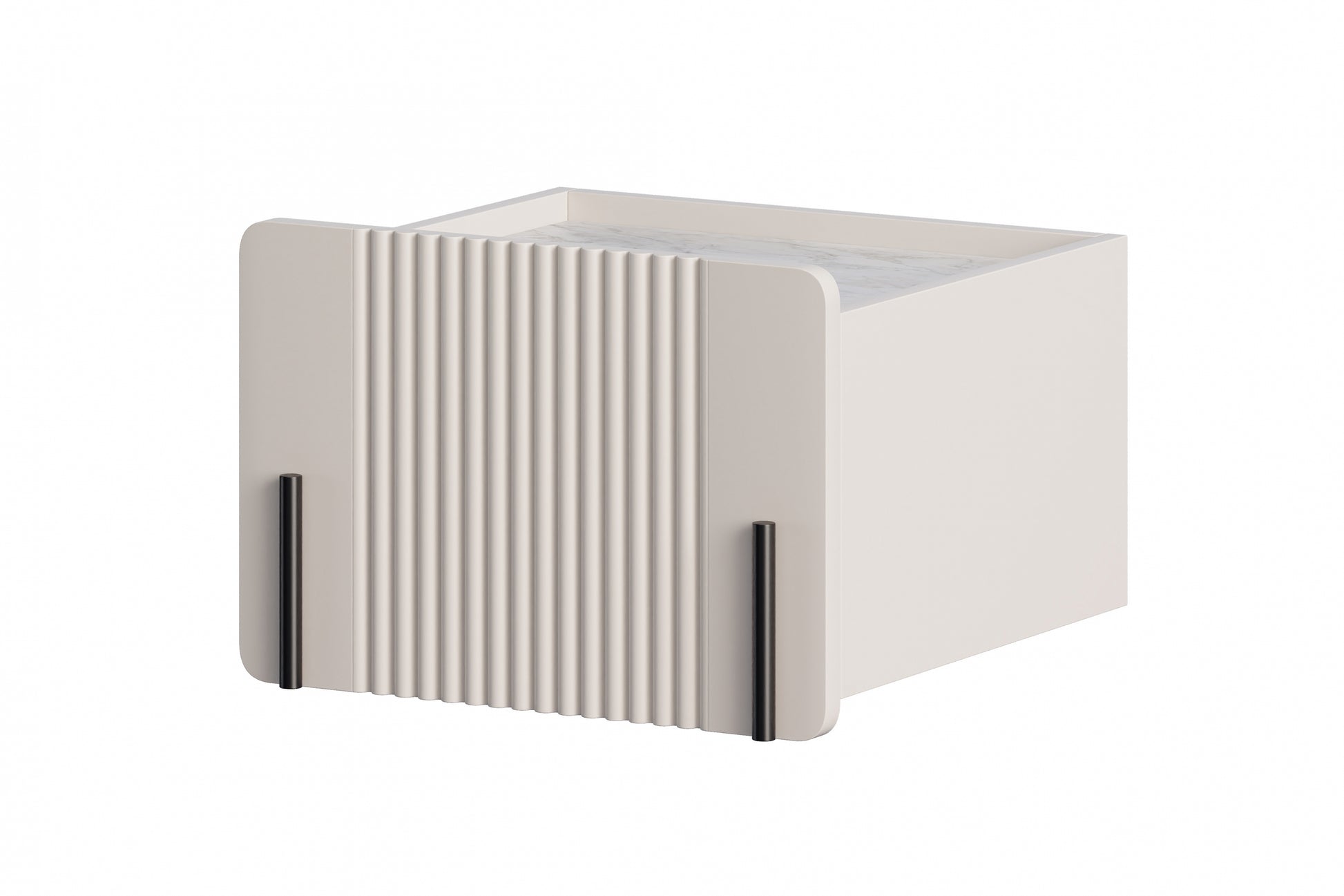 Ontdek het Malmi 45 cm hangend nachtkastje met lade, een moderne eyecatcher die elegantie en functionaliteit combineert. Het subtiele samenspel van mat kasjmier met een crema bianca blad en zwarte details zorgt voor een verfijnde uitstraling in elke slaapkamer. Het nachtkastje beschikt over een uniek gegroefd front van 18 mm MDF en afgeronde randen, waardoor het veilig én stijlvol is. Dankzij het compacte, zwevende design blijft je vloer vrij en oogt je interieur ruimtelijk. Ideaal voor wie op zoek is naar en stijlvolle toevoeging zonder verlies van waardevolle ruimte.