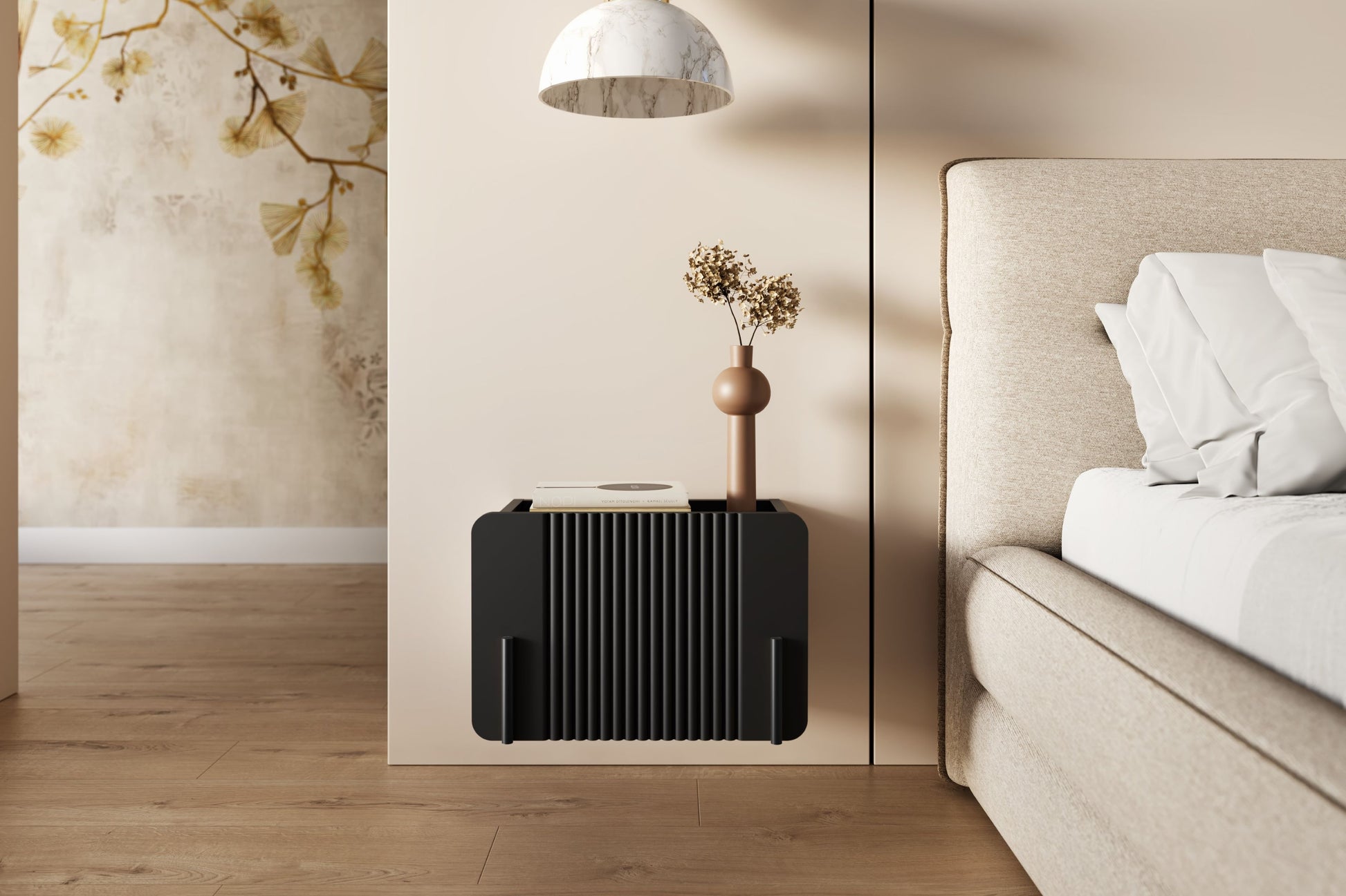 Geef jouw slaapkamer een moderne en luxe uitstraling met het Malmi 45 cm hangend nachtkastje met lade in mat zwart/zwart. Dit stijlvolle nachtkastje heeft een minimalistisch design, afgeronde randen, en een karakteristiek geribbeld front zonder handgrepen. De hangende constructie bespaart ruimte en laat de kamer groter lijken, terwijl de hoogwaardige materialen zorgen voor duurzaamheid. Het push-to-open systeem en de stille lade zorgen voor extra comfort, perfect voor dagelijks en nachtelijk gebruik. Het nachtkastje is ideaal voor moderne, minimalistische en loftinterieurs.
