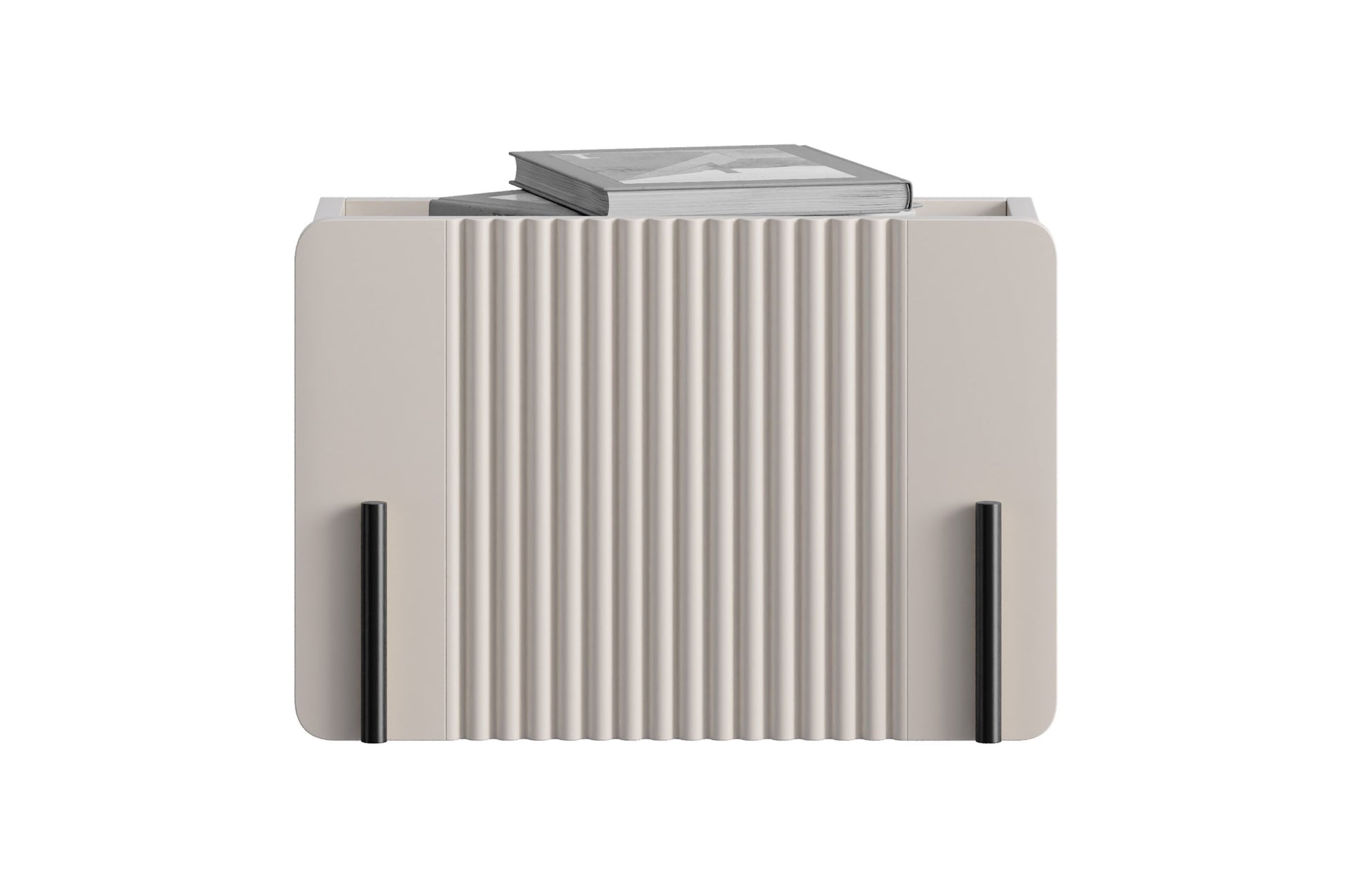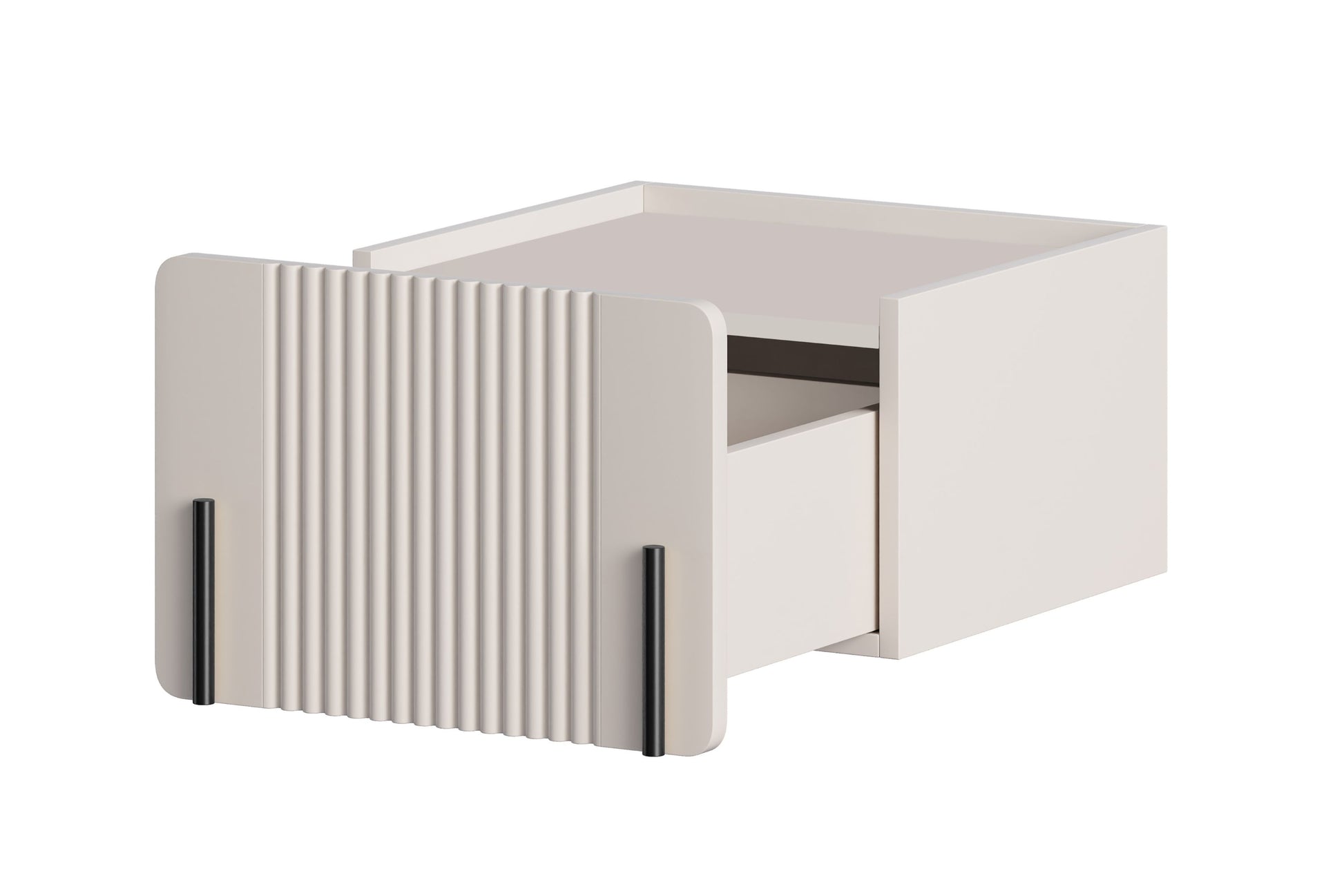 Het Malmi 45 cm hangend nachtkastje met lade in kasjmier/zwart combineert eigentijds design met maximale functionaliteit. De matte kasjmierkleur en gegroefde MDF-fronten geven dit meubel een stijlvolle en luxueuze uitstraling. Dankzij de minimalistische look zonder zichtbare handgrepen, zwarte accenten en afgeronde randen past het nachtkastje perfect bij moderne interieurstijlen. De ophangmogelijkheid geeft niet alleen een zwevend effect, maar maakt het ook gemakkelijk om schoon te houden onder het meubel. Dit nachtkastje is een eyecatcher in elke slaapkamer en biedt optimale ruimte voor je essentials.