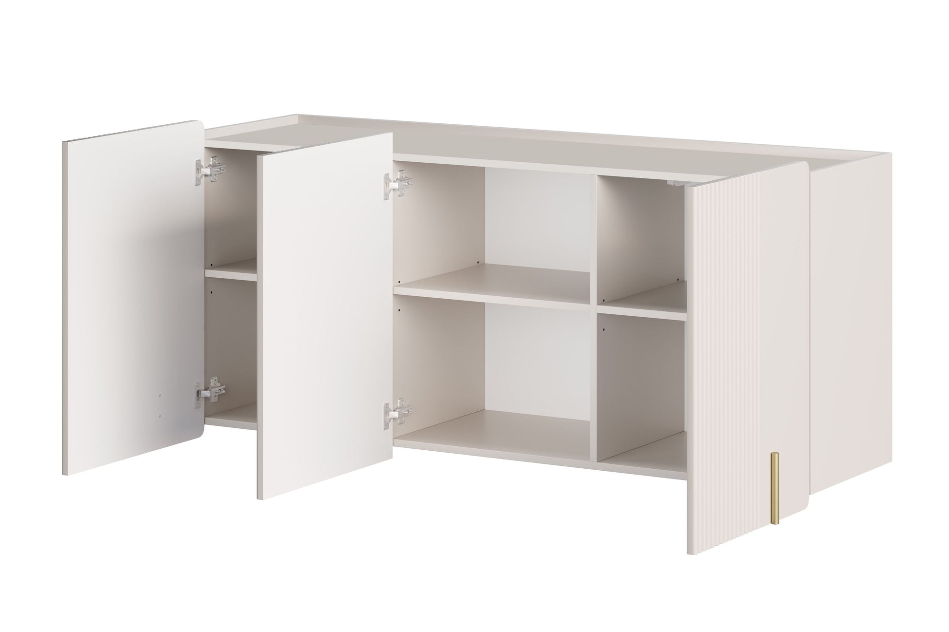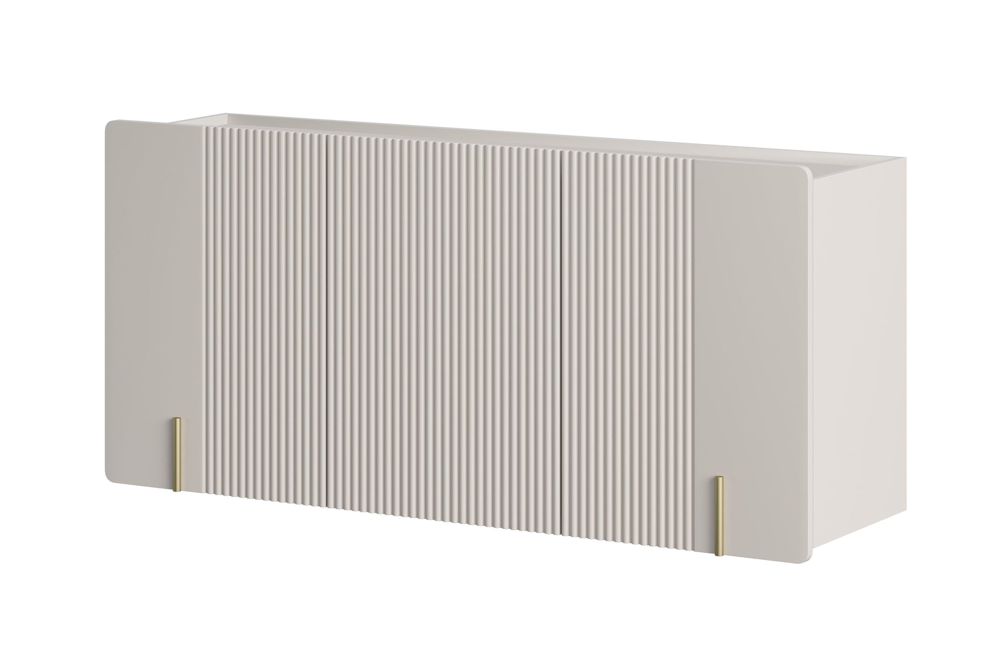 De Malmi hangende ladekast van 150 cm in kasjmier/goud combineert moderne elegantie met praktische functionaliteit. De matte kasjmierkleur, gegroefde fronten van 18 mm MDF en gouden accenten maken dit meubel tot een echte blikvanger in ieder interieur. De afgeronde randen en gebrek aan handgrepen zorgen voor een minimalistische uitstraling, terwijl de hangende constructie de ruimte optisch vergroot. Massieve materialen als gelamineerde plaat en MDF garanderen duurzaamheid en een lange levensduur, zelfs bij dagelijks gebruik in de woonkamer, slaapkamer of kantoor.