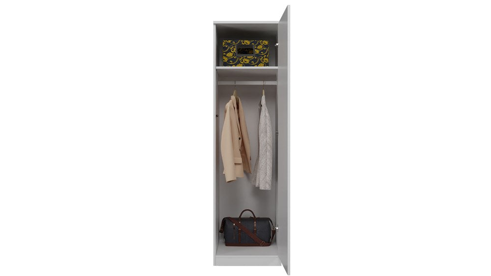 Deze solide afgewerkte kast staat bekend om zijn duurzaamheid en universele karakter. Ideaal voor het opbergen van kleding, jassen of documenten, afhankelijk van uw behoefte. De MALWA SD-50 garderobekast is een slimme keuze voor wie waarde hecht aan moderne esthetiek en praktische oplossingen. U ontvangt een kledingroede en planken in het pakket, eenvoudig te monteren naar wens. Door de ononderbroken kastzijden oogt deze kast extra strak en stijlvol in elk interieur.