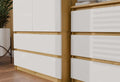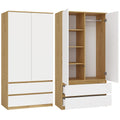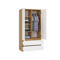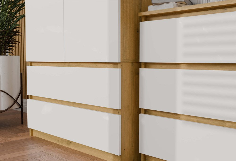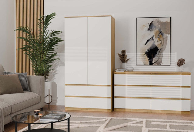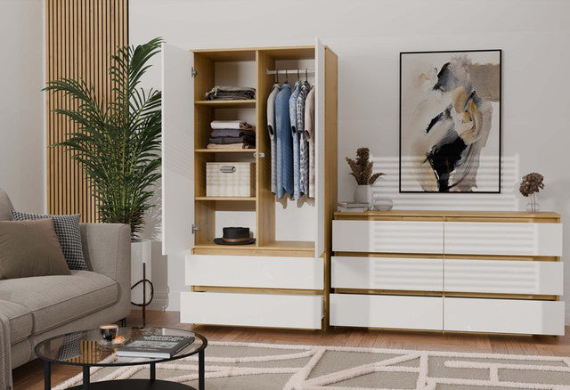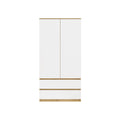 De MALWA SS-90 garderobekast combineert modern design met ultieme functionaliteit. Deze kast is uitgevoerd in een stijlvolle mix van ambachtelijk eikenhout (artisan eik) en witte, gladde fronten. Het slimme interieur biedt vijf planken, een metalen kledingroede en twee ruime lades. Dankzij het greeploze TIP-ON-systeem opent en sluit u de deuren soepel met een lichte aanraking. De solide constructie van 16mm dikke, krasbestendige gelamineerde spaanplaat maakt deze kast ideaal voor dagelijks gebruik.