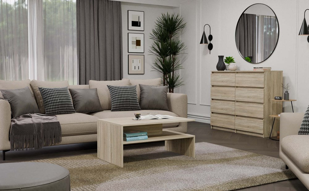 Deze moderne koffietafel Boston in stijlvolle sonoma eiken kleur is de perfecte toevoeging aan iedere woonkamer. Het minimalistische ontwerp combineert eenvoud met elegantie, wat zorgt voor een tijdloos meubelstuk. Gemaakt van 16 mm dik, gelamineerd karton biedt de tafel stabiliteit en duurzaamheid. De gladde zijkanten zonder doppen geven de tafel een strakke uitstraling, terwijl het Poolse vakmanschap garant staat voor hoge kwaliteit. Met een ruime tafelblad van 60 x 90 cm en een moderne uitstraling past de koffietafel moeiteloos in diverse interieurstijlen.