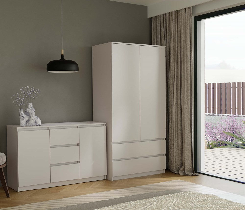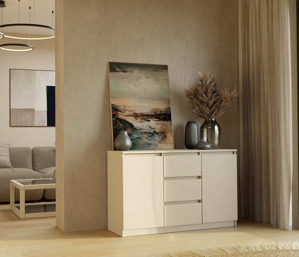 Ontdek de perfecte combinatie van elegantie en functionaliteit met deze moderne kist 2D3S 120 cm in een modieuze kasjmier kleur. Het minimalistische design, strakke lijnen en greeploze fronten geven deze ladekast een eigentijdse uitstraling die past binnen elk interieur. Dankzij twee deuren en drie ruime lades biedt dit meubelstuk volop opbergruimte voor kleding, accessoires of speelgoed, terwijl het kras- en vochtbestendige materiaal zorgt voor een langdurig mooi uiterlijk.