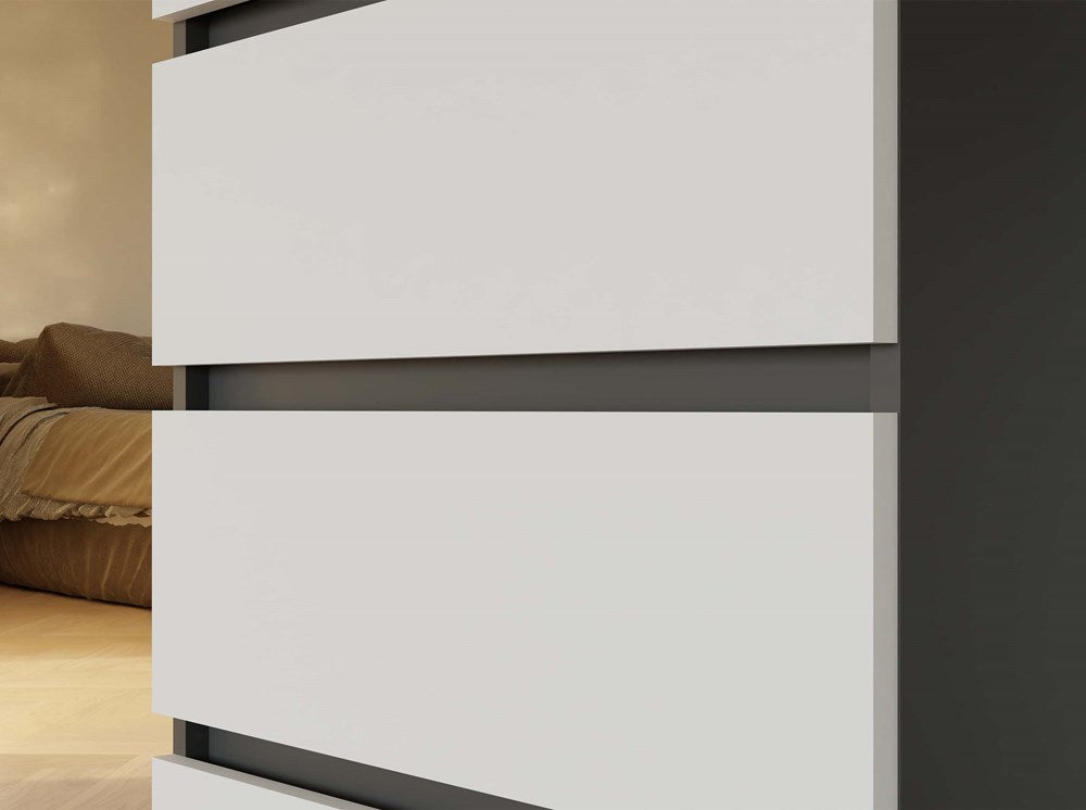 De MALWA M4 ladekast biedt ruime opberglades op soepele rolgeleiders voor veilig en comfortabel gebruik. Ideaal voor het organiseren van kleding, speelgoed of dagelijkse benodigdheden. De combinatie van antraciet en wit zorgt voor een stijlvolle, tijdloze uitstraling die harmonieus in diverse interieurstijlen past. Dankzij de ABS-afgewerkte randen zijn de meubels extra beschermd tegen stoten en slijtage. Deze multifunctionele kast is eenvoudig te onderhouden en perfect voor iedereen die op zoek is naar een combinatie van elegantie, functionaliteit en hoge kwaliteit.