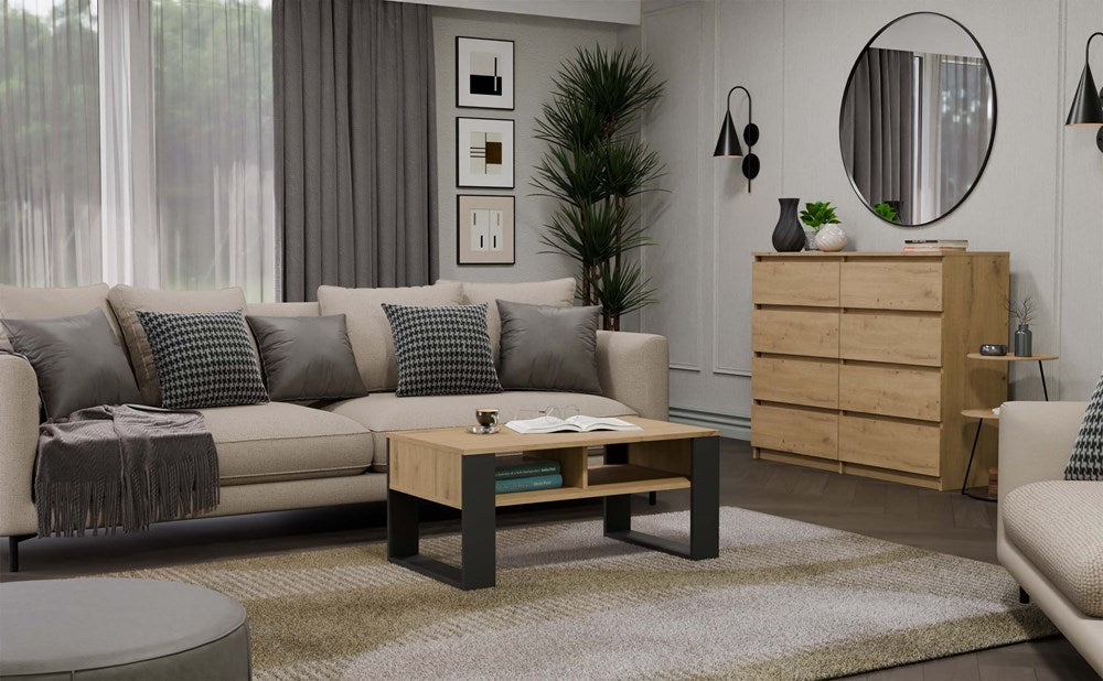 Breng stijlvolle elegantie en praktische functionaliteit in je woonkamer met de moderne salontafel "MODERNE 2P". Dit eigentijdse meubelstuk combineert een tafelblad in ambachtelijk eiken met stevige antraciete poten voor een luxueuze uitstraling. Door het gebruik van gelamineerd spaanplaat met verhoogde hardheid is de tafel extra krasbestendig, wat zorgt voor langdurige schoonheid. Dankzij de eenvoudige montage-instructies en de Poolse makelij ben je verzekerd van topkwaliteit en handig gebruiksgemak.