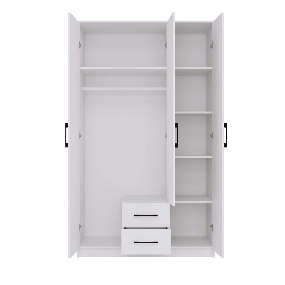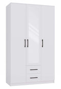 De ROMANA 120 kledingkast biedt een ideale mix van esthetiek en functionaliteit in een strak wit design. Met drie deuren, een grote spiegel en twee ruime lades biedt deze kast voldoende opbergruimte voor al je kleding, accessoires en kleine benodigdheden. De kast is ontworpen met praktische interne planken, een stang voor hangers en moderne zwarte kunststof handgrepen. Dankzij de stevige constructie van 16 mm dikke gelamineerde spaanplaat garandeert de ROMANA 120 zowel duurzaamheid als stijl – perfect voor elk modern interieur.