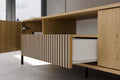 Geef je woonkamer een eigentijdse uitstraling met de moderne TV-kast Kamaro 160 cm. Deze stijlvolle kast combineert een minimalistisch ontwerp met functionele oplossingen zoals ruime lades, afsluitbare kasten en een open plank met een handig gat voor kabelmanagement. Het opvallende uiterlijk, met ambachtelijk eiken en zwarte accenten, past perfect bij moderne, Scandinavische of loft interieurs. De verticale, gefreesde lamellen op de fronten en stevige metalen poten zorgen voor een unieke uitstraling en optimale stabiliteit. Met Kamaro kies je voor design én functionaliteit in huis.