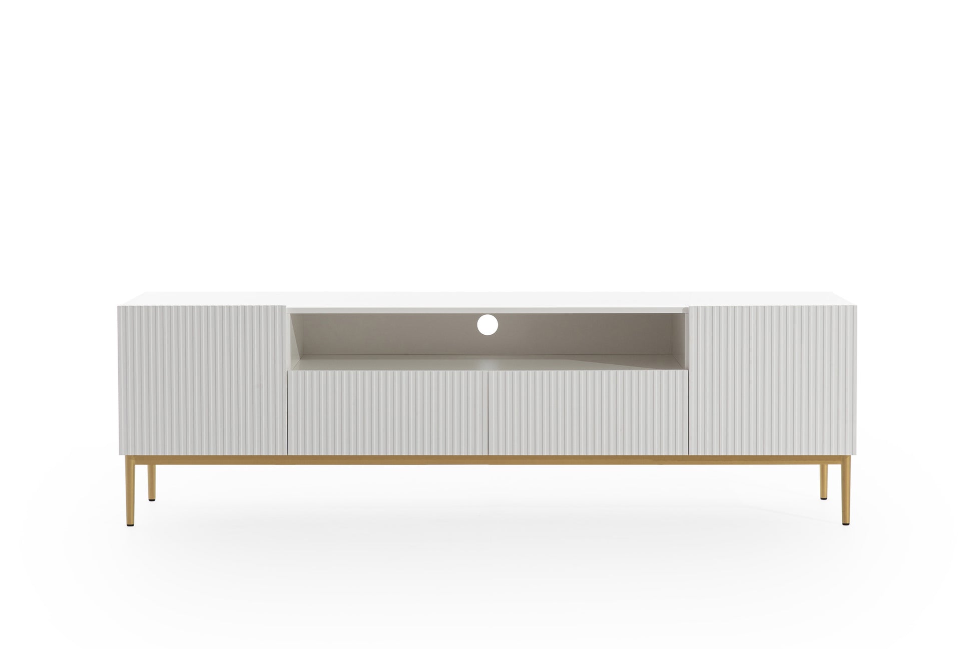 Het Nicole TV-meubel van 200 cm combineert luxe met functionaliteit door een strak, wit mat uiterlijk met elegante gouden poten. Dit moderne en minimalistische meubelstuk biedt gegroefde fronten en een handgreeploos ontwerp voor een subtiele, stijlvolle uitstraling in uw interieur. Dankzij het gebruik van hoogwaardige materialen zoals gelamineerd karton en MDF, garandeert dit meubel duurzaamheid, terwijl ABS-randen zorgen voor een langdurige esthetiek. Met een ruime nis en twee stille lades is het ideaal voor het opbergen van elektronica, accessoires en alledaagse spulletjes.