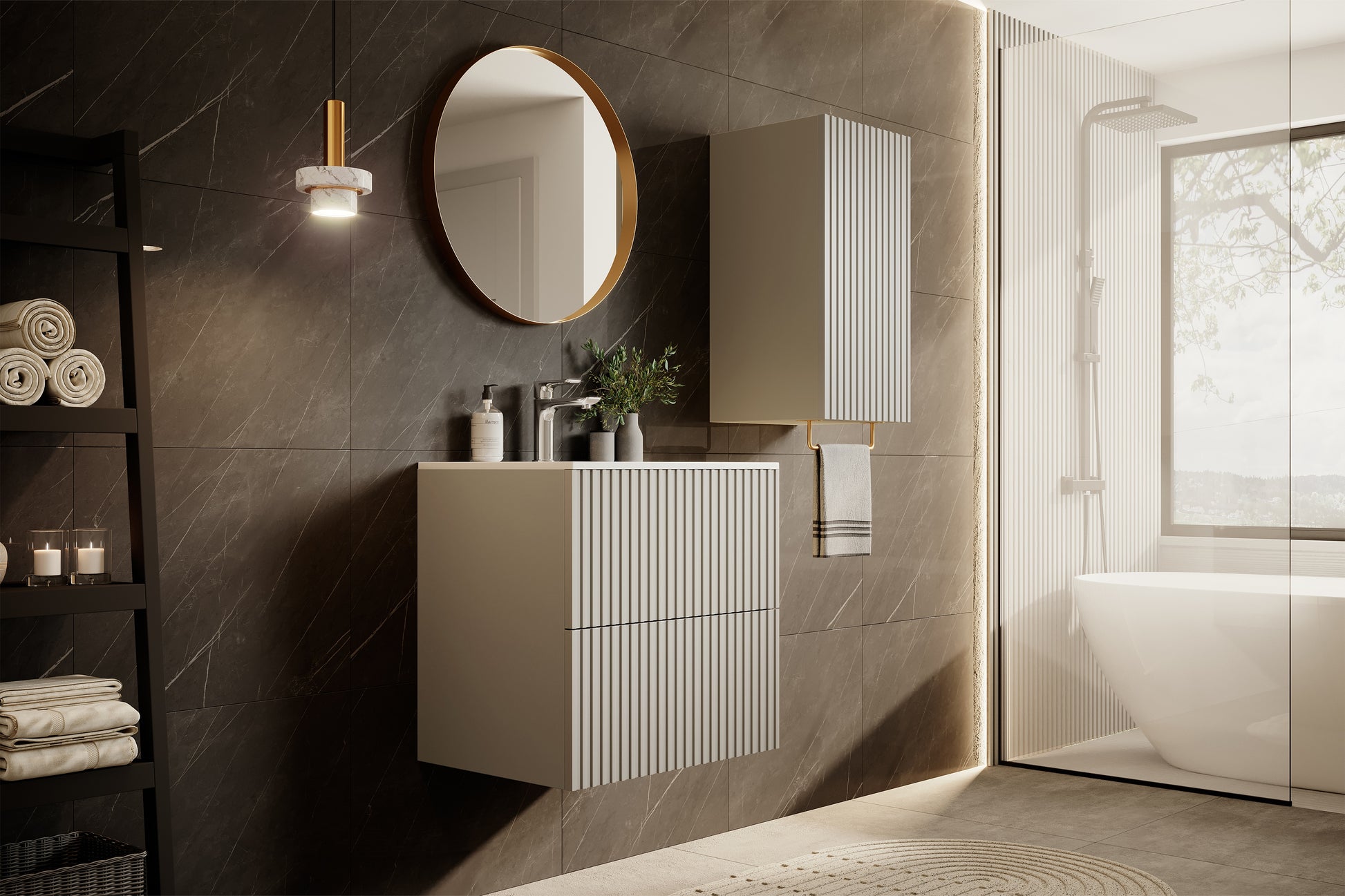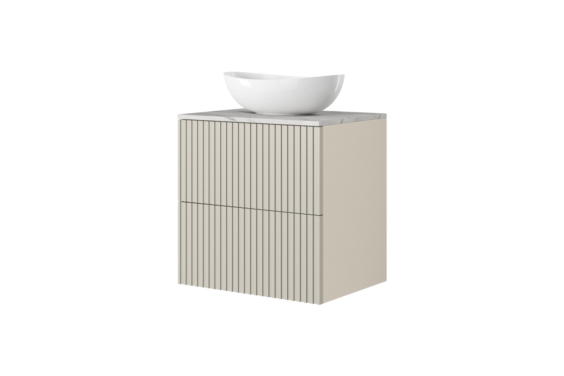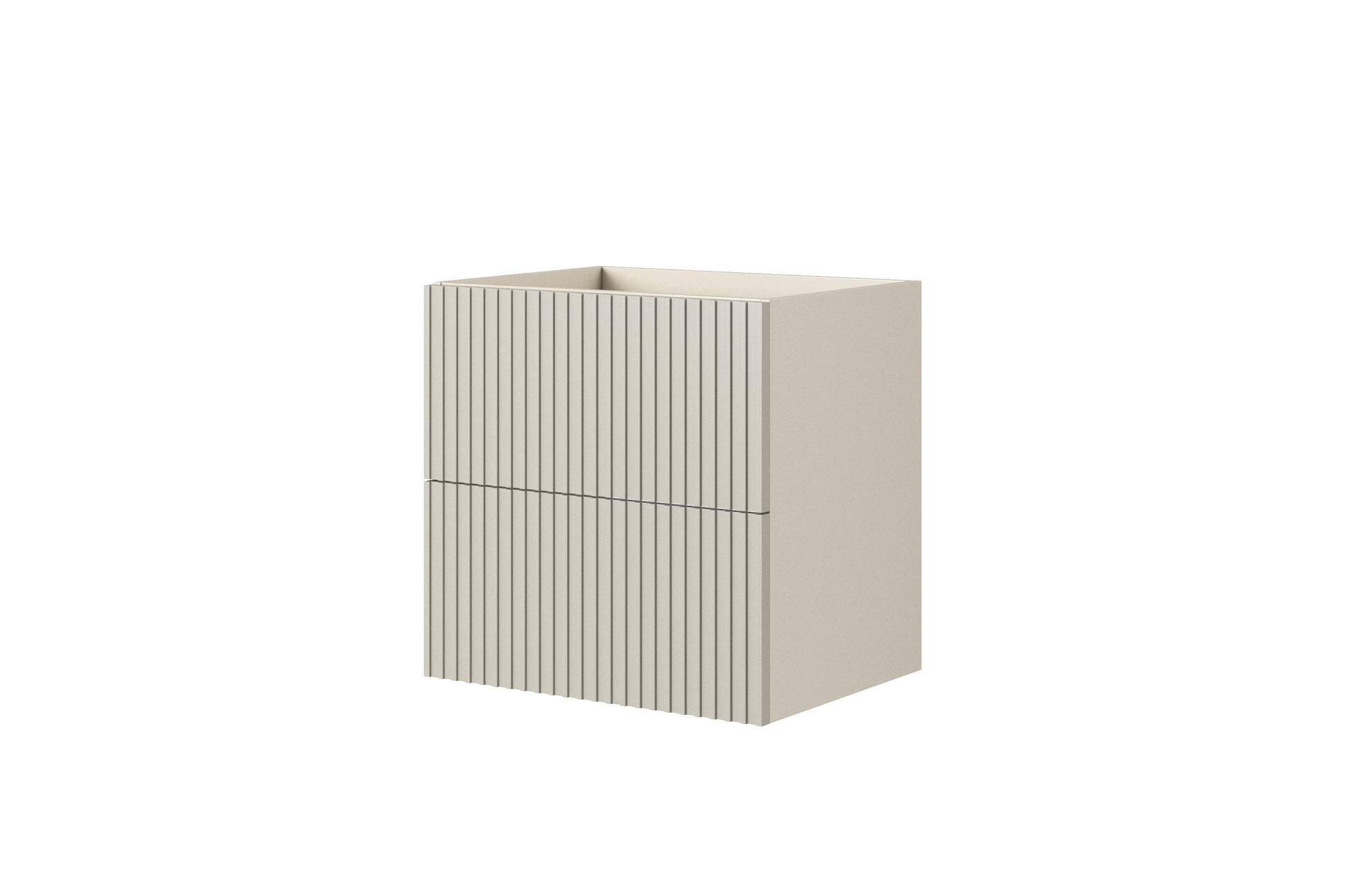 Ontdek de stijlvolle Nicole wandwastafelkast in kasjmier: een perfecte keuze voor kleine en middelgrote badkamers. Het moderne, matte design met gegroefde voorkant straalt luxe uit en past prima in zowel Scandinavische als klassieke interieurs. De kast is vervaardigd uit duurzame 16 mm gelamineerd karton en 18 mm MDF, wat zorgt voor langdurige vochtbestendigheid. Met twee ruime lades en een "push to open"-systeem biedt deze hangkast comfort en ruimte voor al uw badkamerbenodigdheden.