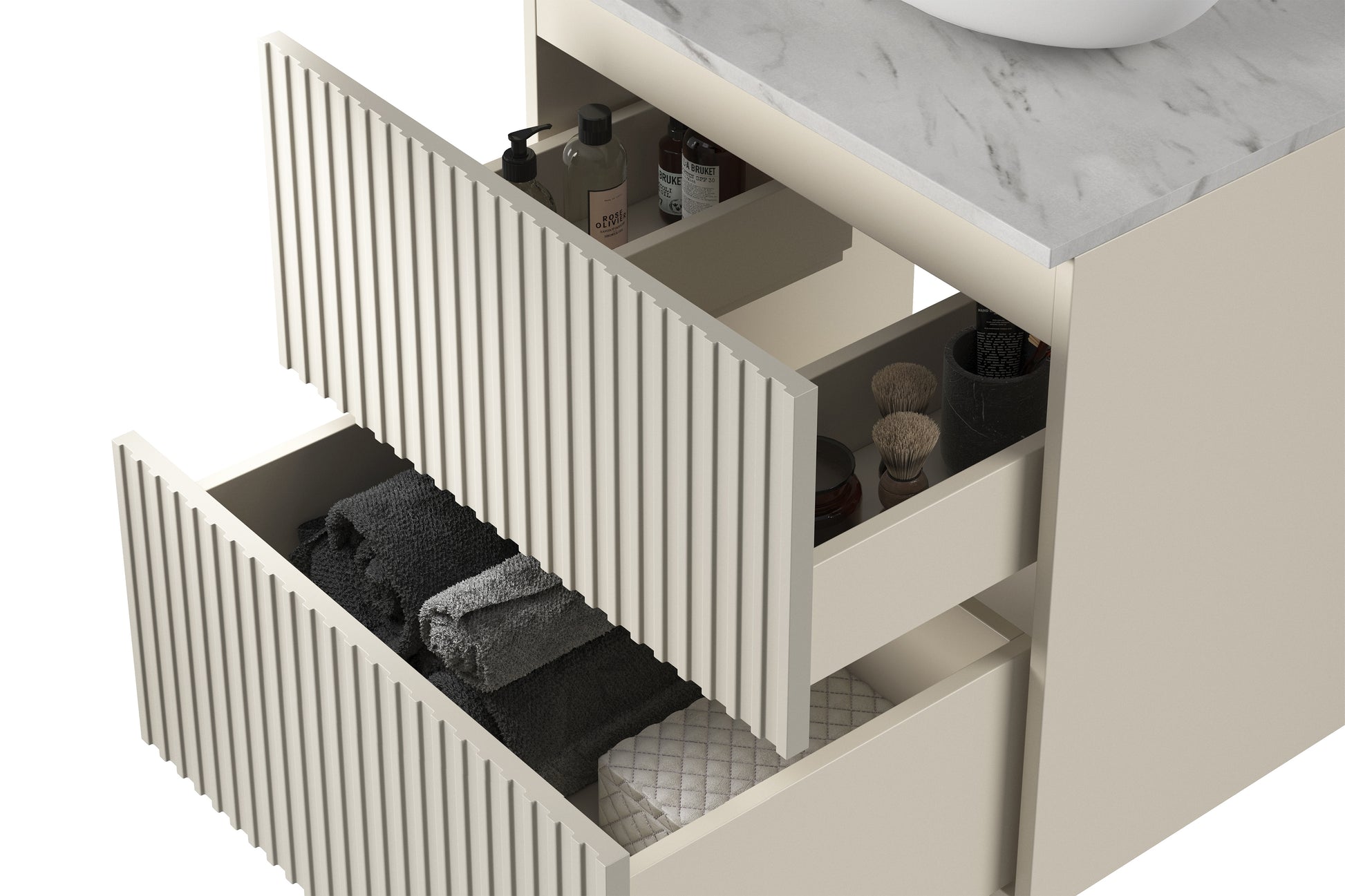 De Nicole wastafelkast levert optimaal gebruiksgemak dankzij het innovatieve fatsoenvriendelijke openingsmechanisme en een minimalistische look. Ruime lades maken het eenvoudig om handdoeken, verzorgingsproducten of schoonmaakmiddelen op te bergen. De kasjmier matte kleur geeft uw badkamer een tijdloze uitstraling, terwijl het meubel geen vloerruimte inneemt. Ideaal voor wie elegantie, functionaliteit en ruimtebesparing in de badkamer wil combineren.