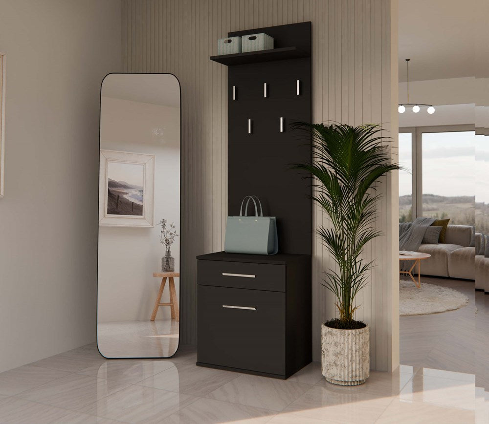 De schoenenkast en hanger "DUO" is dé keuze voor liefhebbers van modern meubilair met een stijlvolle uitstraling. Dankzij het strakke ontwerp in mat zwart past dit meubel moeiteloos in elk modern interieur. Het praktische duo bestaat uit een solide schoenenkast met een handige lade en een compact kastje, compleet met vijf hangers en een functionele plank. De hoogwaardige afwerking en de duurzame materialen maken deze set niet alleen elegant, maar ook bijzonder robuust. Laat uw hal stralen met deze functionele en esthetische blikvanger van Poolse makelij.