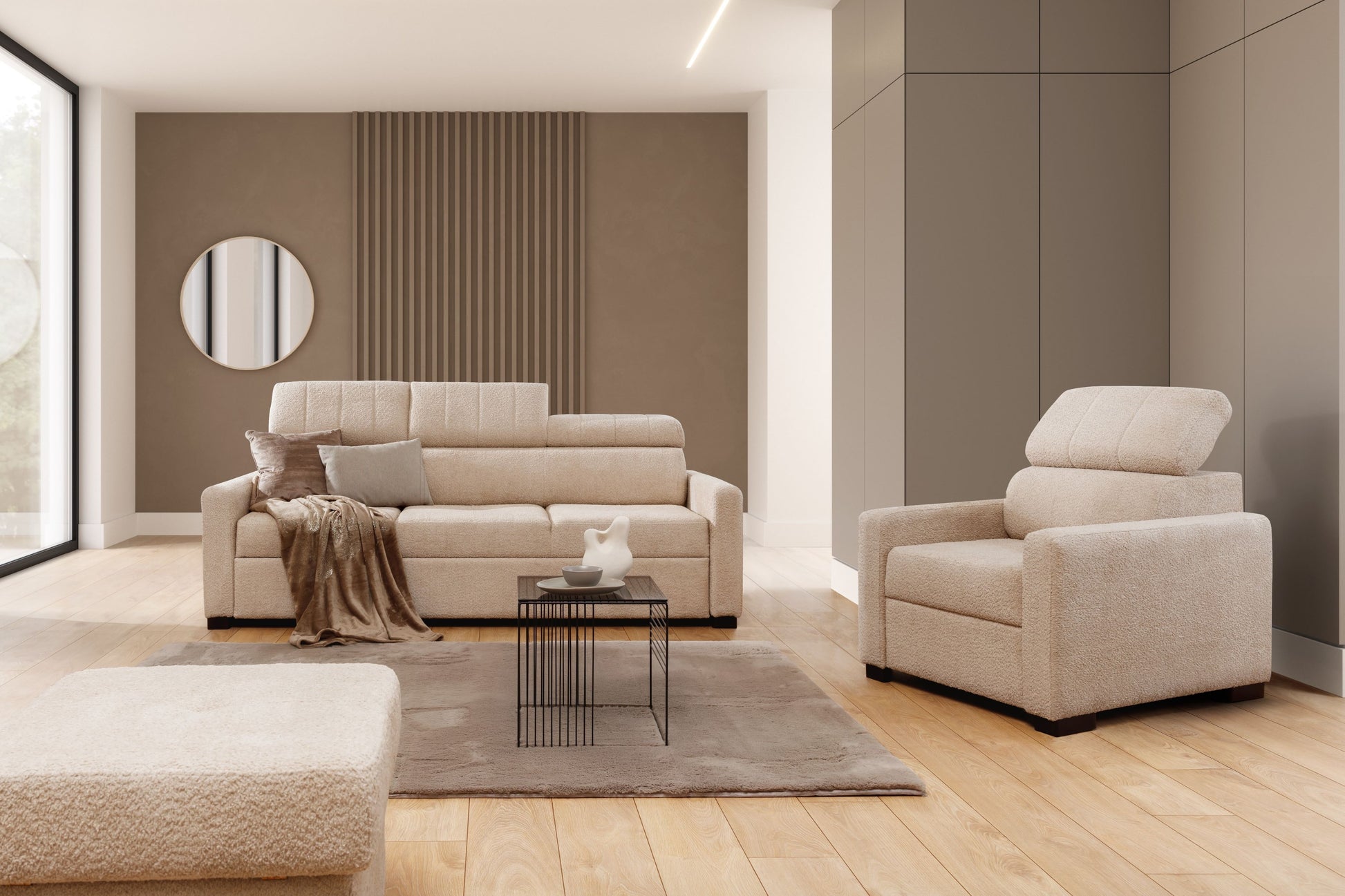 Ervaar ultiem comfort met de Taremo loungestoel, ontworpen met een verstelbare hoofdsteun voor optimale ontspanning. Met zijn moderne uitstraling en zorgvuldig gekozen kleur past deze stoel perfect in elk interieur. De combinatie van een stevig houten frame, golfveren en duurzaam T30 polyurethaanschuim in de zitting zorgt voor langdurige ondersteuning en comfort. De rugleuning is uitgevoerd met T25 schuim voor extra zitgemak. Deze loungestoel combineert stijl en gebruiksgemak, waardoor het een must-have is voor wie comfort en design waardeert.