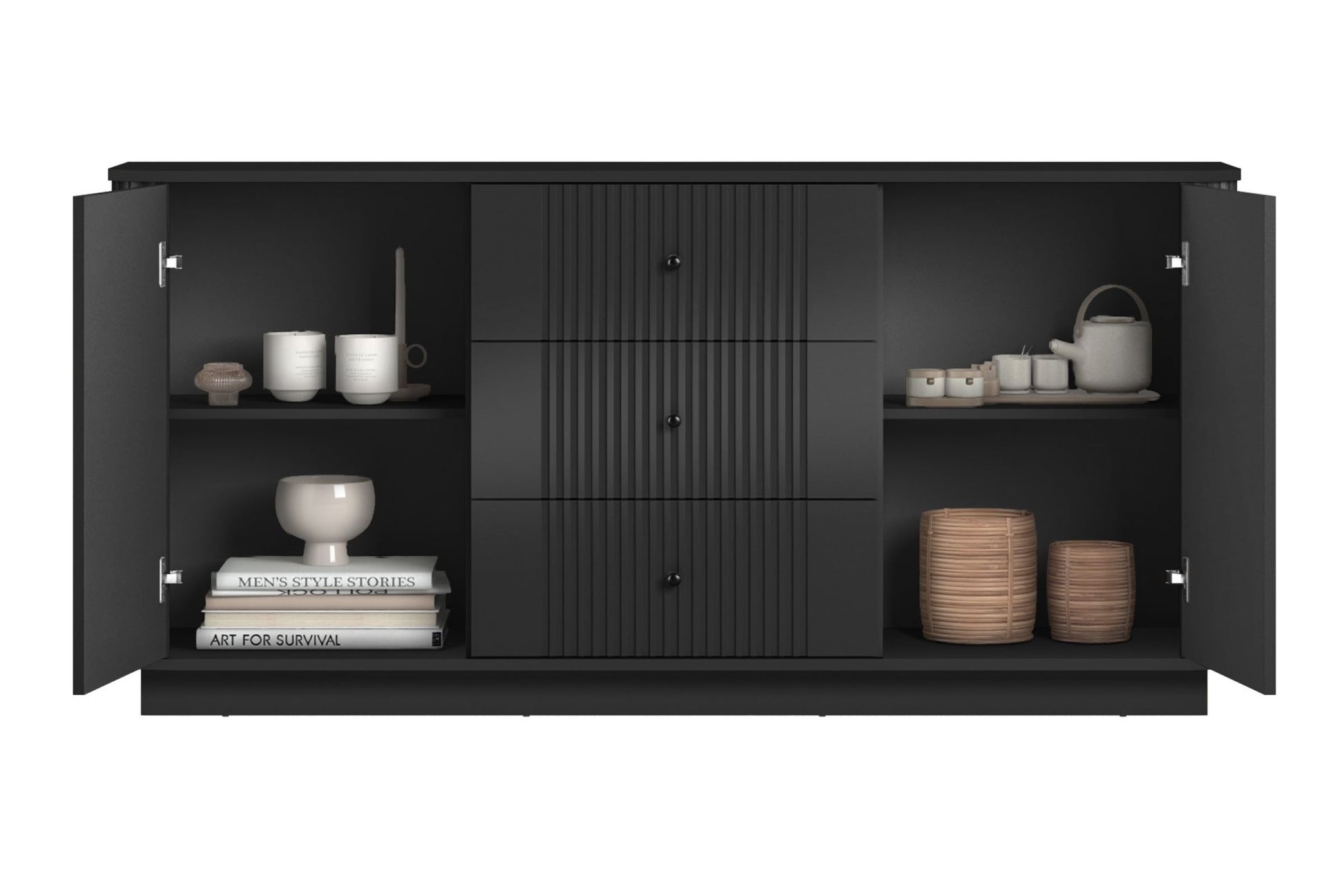 Ontdek de stijlvolle Vesper ladekast van 160 cm in diepzwart, ontworpen voor moderne woonkamers of eetkamers. Deze kast onderscheidt zich door elegante gegroefde MDF-fronten en robuuste, minimalistische zwarte metalen handgrepen. Gemaakt van massief gelamineerde plaat en 16 mm dik MDF biedt deze kast duurzaamheid en een fraaie matte uitstraling. De afgeronde randen verhogen het gebruikscomfort én de stijlvolle uitstraling. Met drie ruime lades en twee afsluitbare kasten biedt de Vesper ladekast volop opbergruimte voor al uw spullen – een combinatie van design en functionaliteit.
