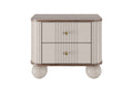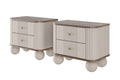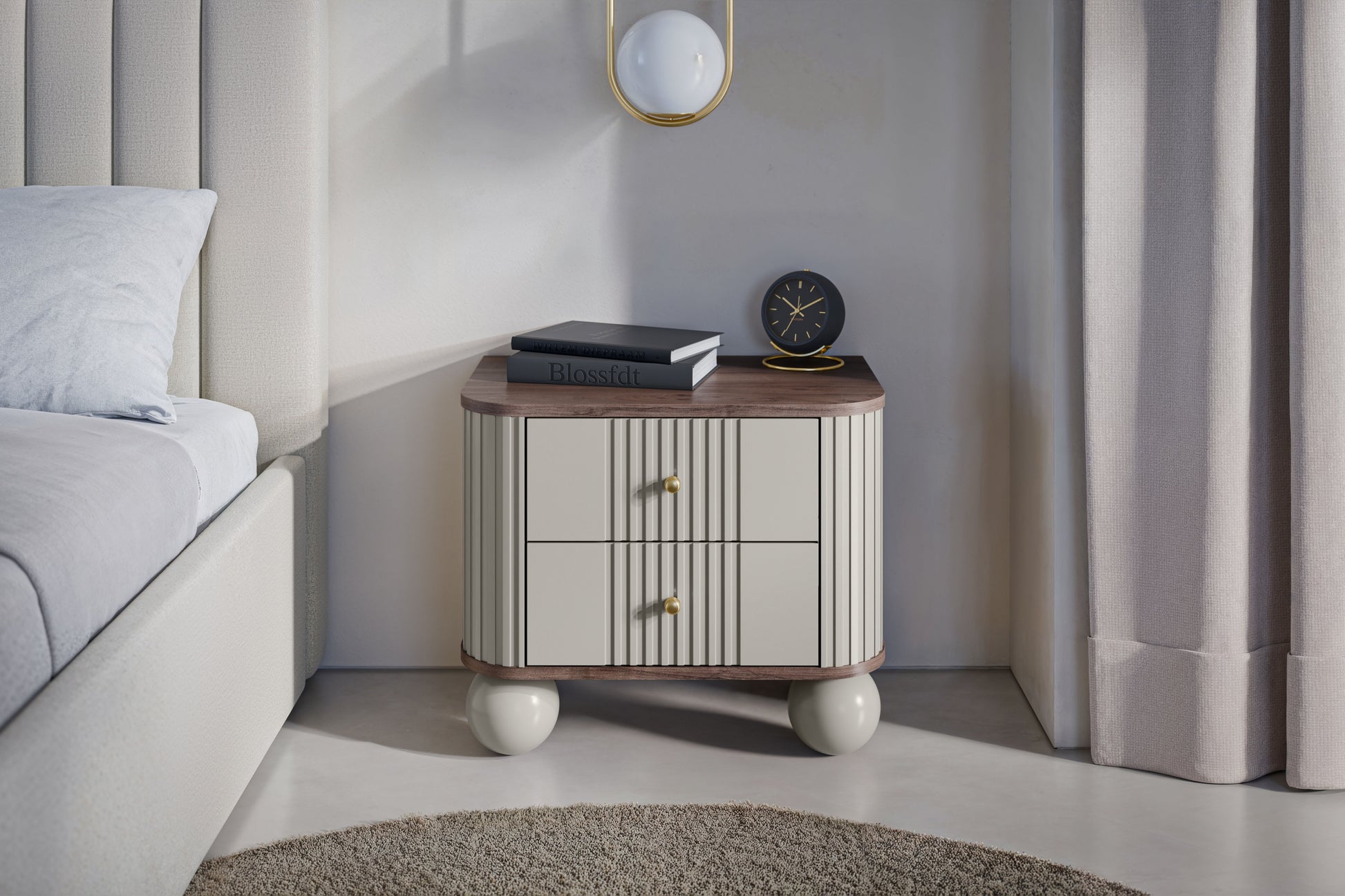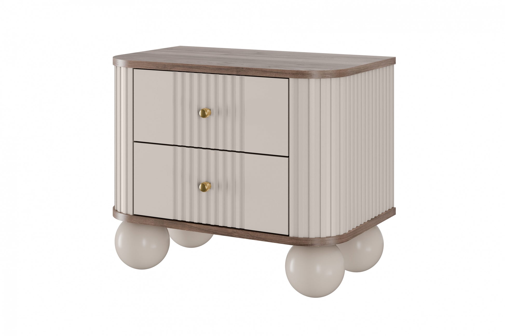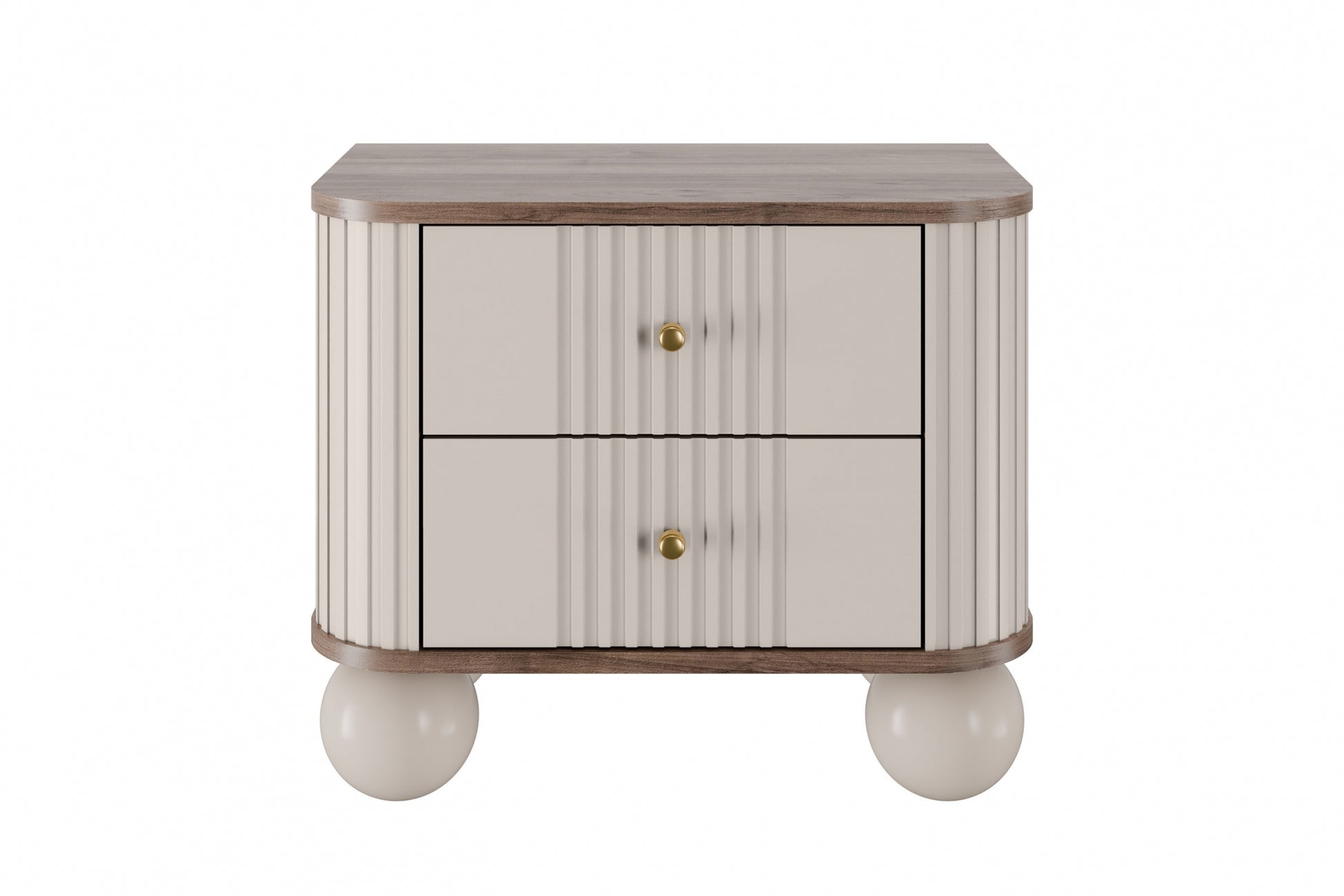 Voeg een vleugje luxe en stijl toe aan je slaapkamer met de Vesper nachtkastjeset van 56 cm, uitgevoerd in kasjmier en walnoot met elegante gouden handgrepen en bolvormige houten poten. Deze nachtkastjes combineren functionaliteit met een uniek design, gekenmerkt door afgeronde randen en gegroefde MDF-fronten. De solide constructie van gelamineerd karton en MDF, samen met luxe metalen details, zorgt voor een lange levensduur. Dankzij het compacte formaat passen ze perfect in zowel ruime als kleinere slaapkamers en bieden ze voldoende opbergruimte dankzij twee ruime lades per kastje.