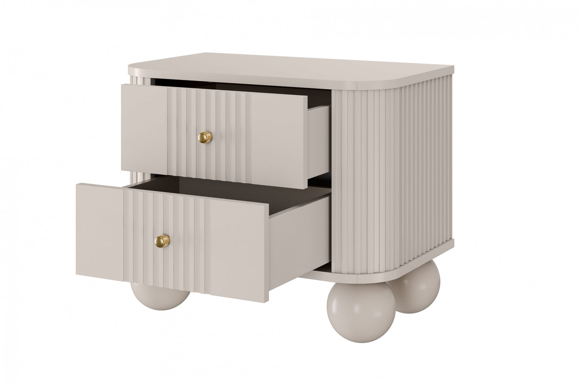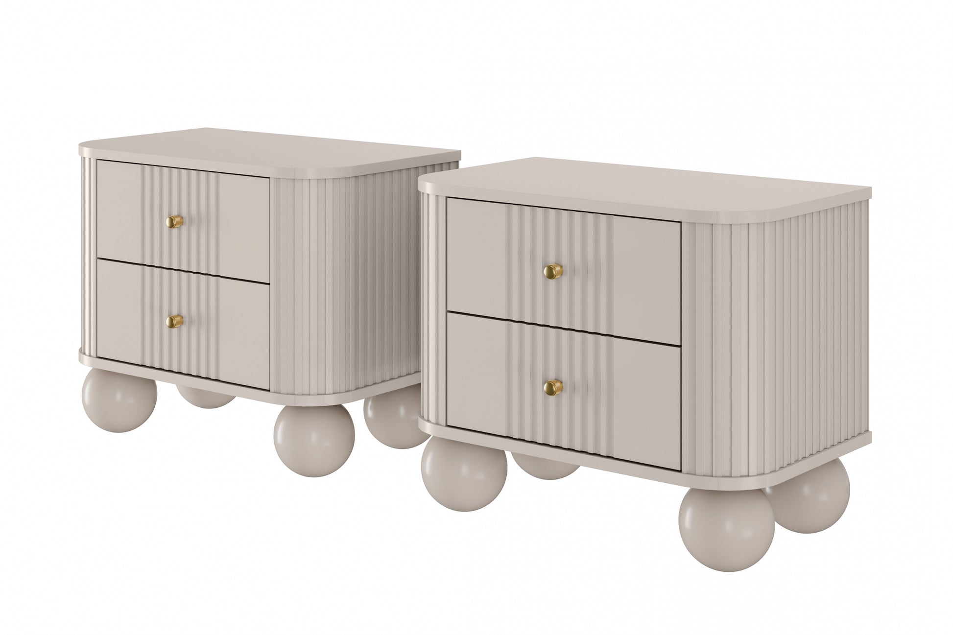 De Vesper nachtkastjeset van 56 cm in kasjmierkleur, met gouden handgrepen en opvallende bolpoten, voegt direct een gevoel van luxe toe aan je slaapkamer. Het eigentijdse ontwerp met geribbelde MDF-fronten, afgeronde randen en een matte afwerking combineert stijl met functionaliteit. Twee ruime lades met een stille sluiting zorgen voor voldoende opbergruimte en gebruiksgemak. De combinatie van massief MDF, gelamineerde kartonromp en stevige houten poten staat garant voor jarenlang plezier en een exclusieve uitstraling in iedere slaapkamer.