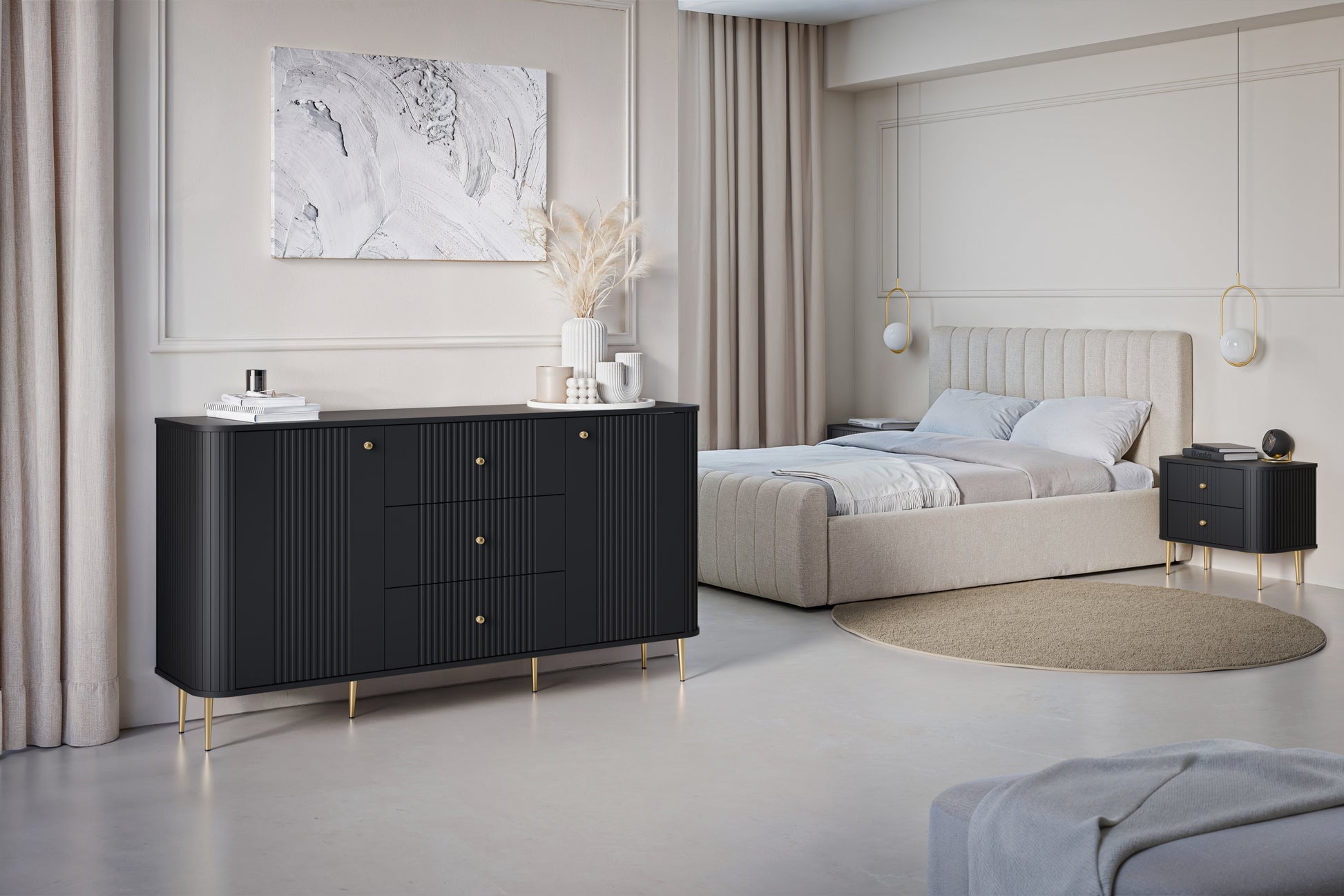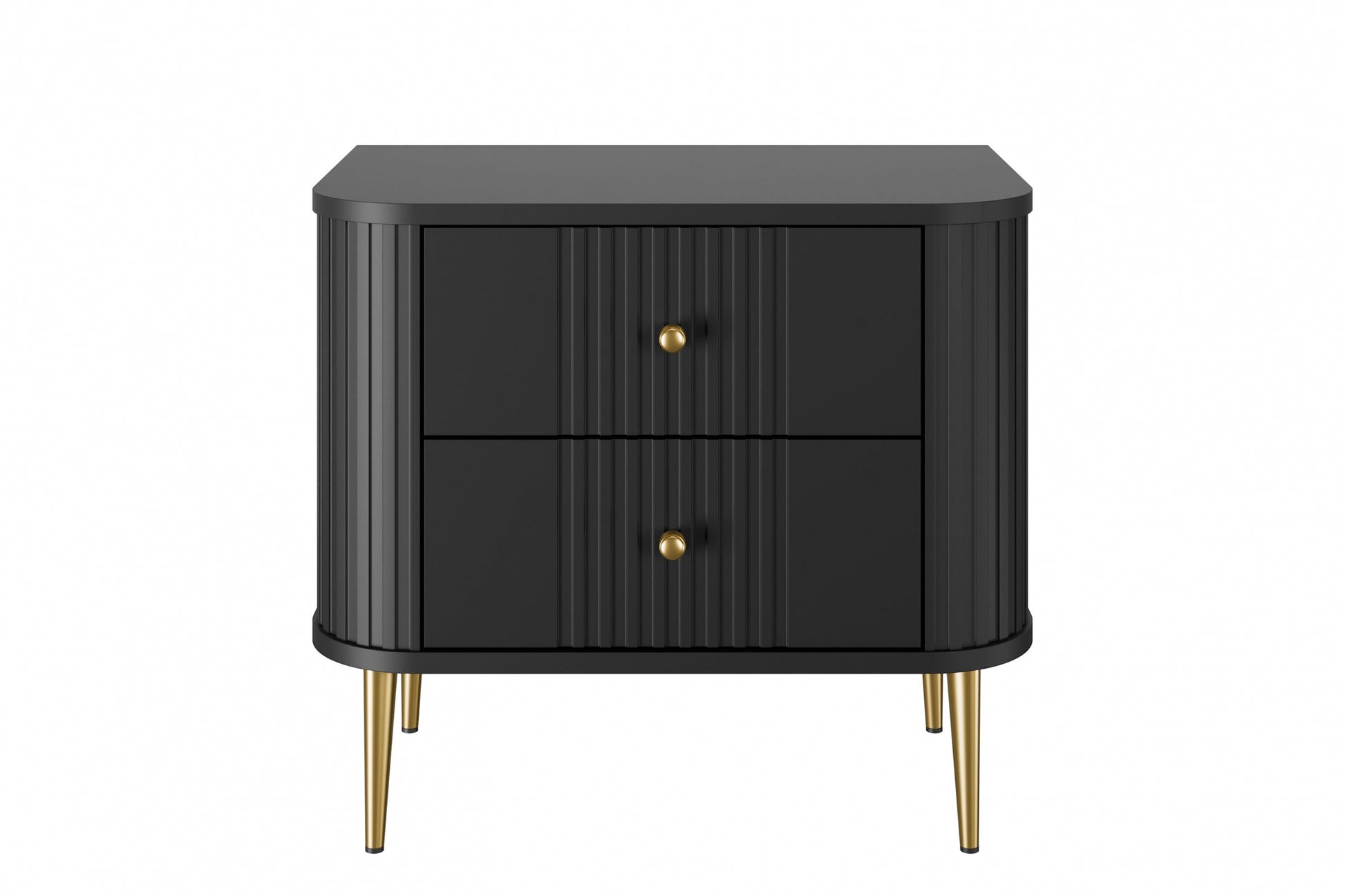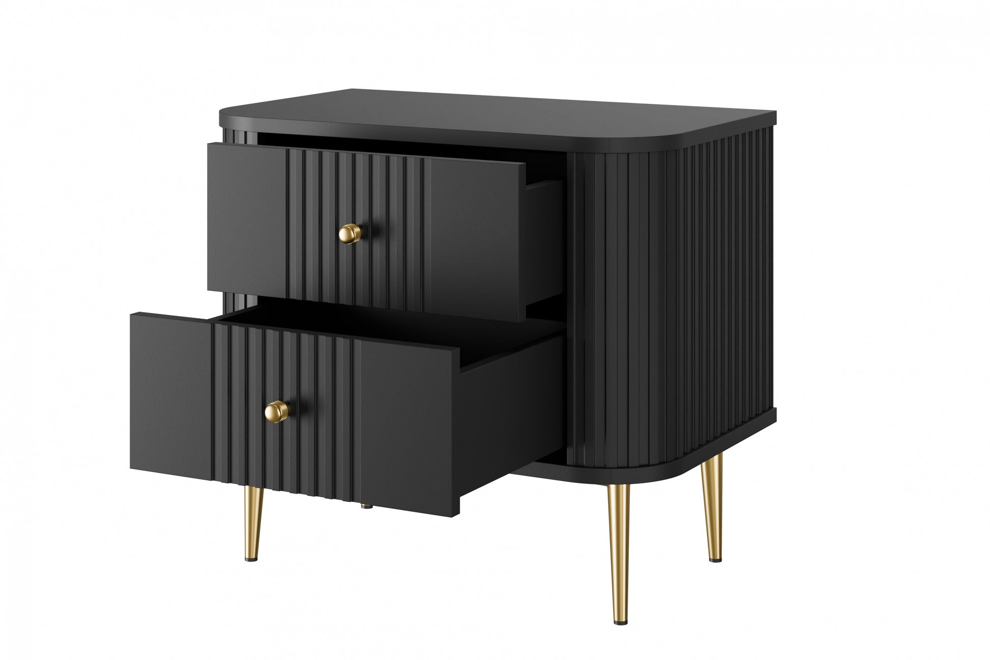 Ontdek de Vesper nachtkastjeset van 56 cm: een stijlvolle en praktische toevoeging aan elke slaapkamer! Deze set bevat twee elegant vormgegeven nachtkastjes uitgevoerd in diepzwart met expressieve gouden metalen poten. Dankzij de unieke geribbelde fronten krijgt het meubel een modern 3D-effect. De afgeronde randen dragen bij aan het luxe en harmonieuze geheel en zorgen voor extra veiligheid. De stabiele constructie van 16 mm dik MDF en gelamineerde plaat garandeert langdurige duurzaamheid en stevigheid, terwijl de matte afwerking een moderne look geeft aan uw interieur.