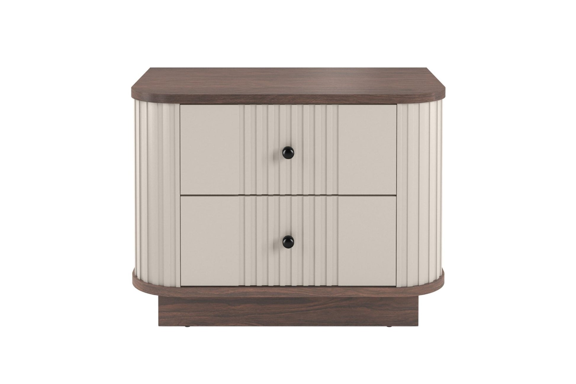 Ontdek de Vesper 56 cm set nachtkastjes, dé perfecte combinatie van stijl en functionaliteit voor jouw slaapkamer. De unieke mix van warm kasjmier, karakteristiek walnoothout en elegante zwarte handgrepen maken deze nachtkastjes een echte blikvanger. Geribbelde MDF-fronten en afgeronde hoeken zorgen voor een verfijnde uitstraling, terwijl de stevige minimalistische sokkel de meubels licht én solide doet ogen. Elke kast is voorzien van twee ruime lades met een stil sluitsysteem, ideaal om al jouw nachtkastbenodigdheden keurig op te bergen. Hoogwaardige materialen garanderen langdurig gebruiksgemak en duurzaamheid.
