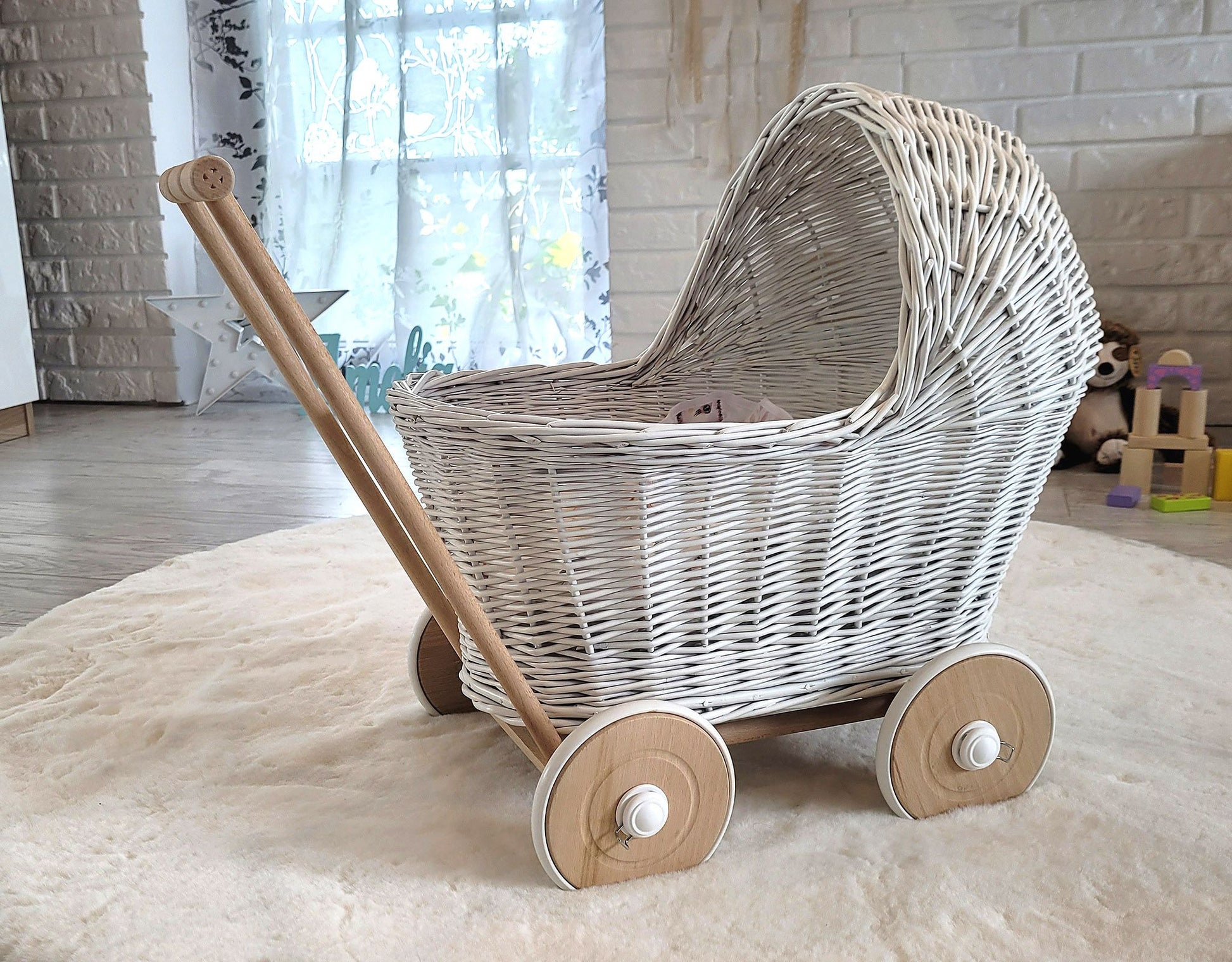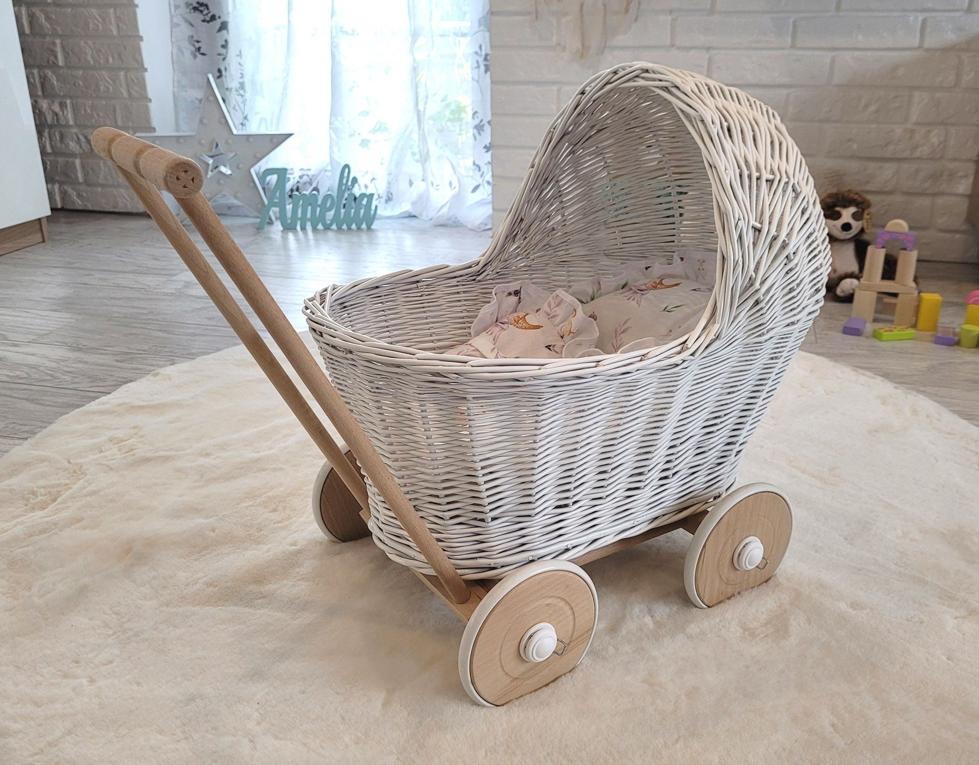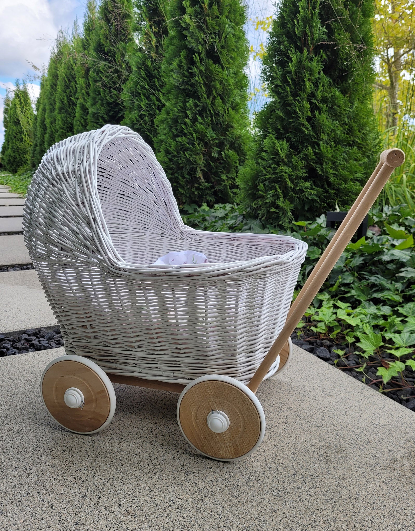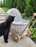 Weißer Puppenwagen – Weidenkorbwagen – aus robustem Buchenholz mit leichtgängigen Gummirädern