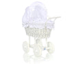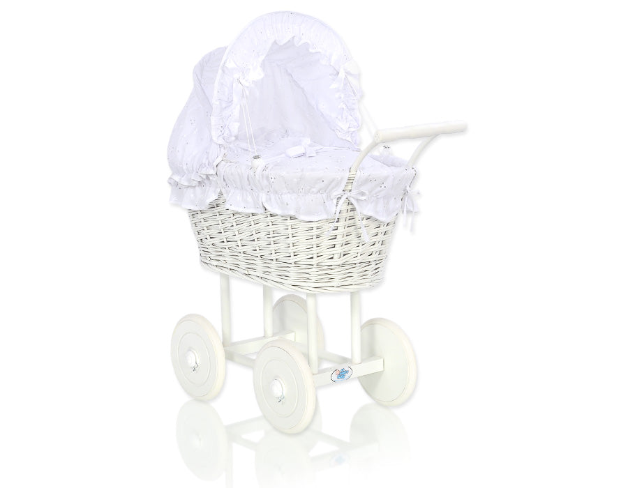 Weißer Puppenwagen aus Weide – Spielzeugwagen – mit Baumwollbezug und leichtgängigem Gestell