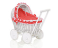 Weißer Puppenwagen aus Weide mit roter Bettwäsche und weichem Futter