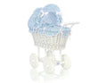 Weißer Puppenwagen aus Weide – robuster und sicherer Weidenspielzeugwagen mit blauem Bezug