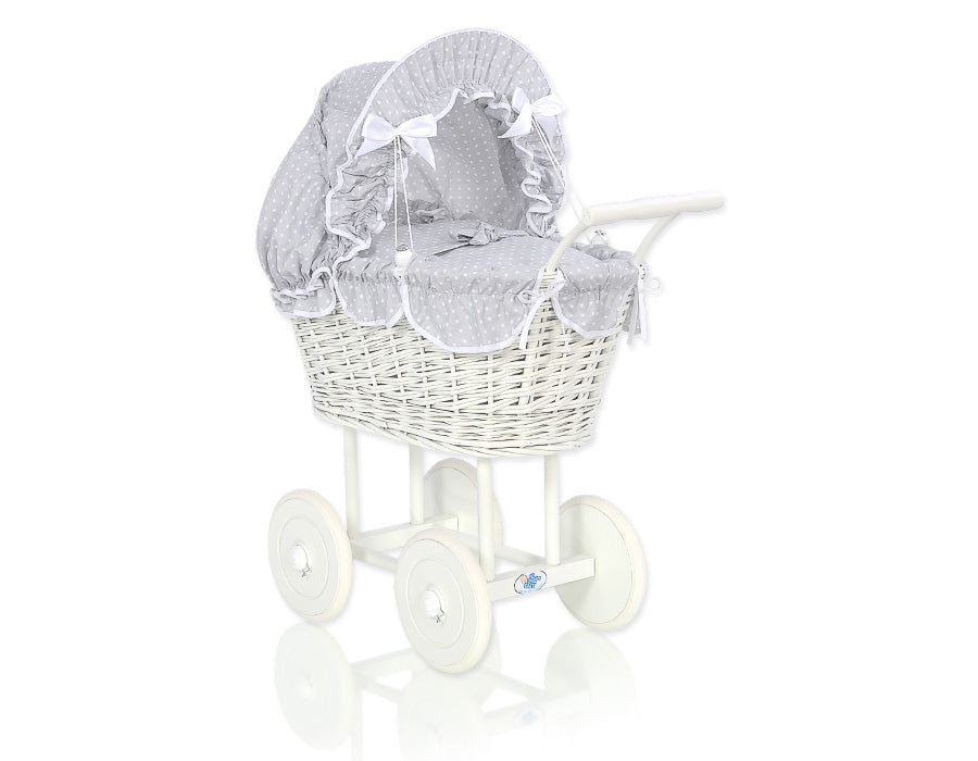 Weißer Puppenwagen aus Weide mit grauem Bezug und Polsterung
