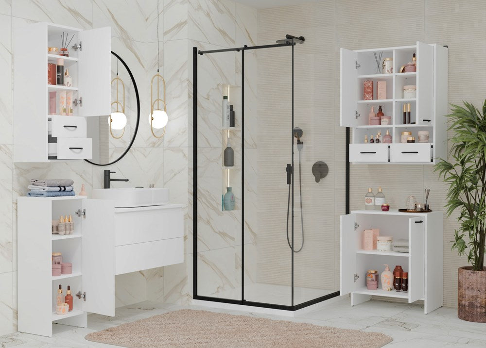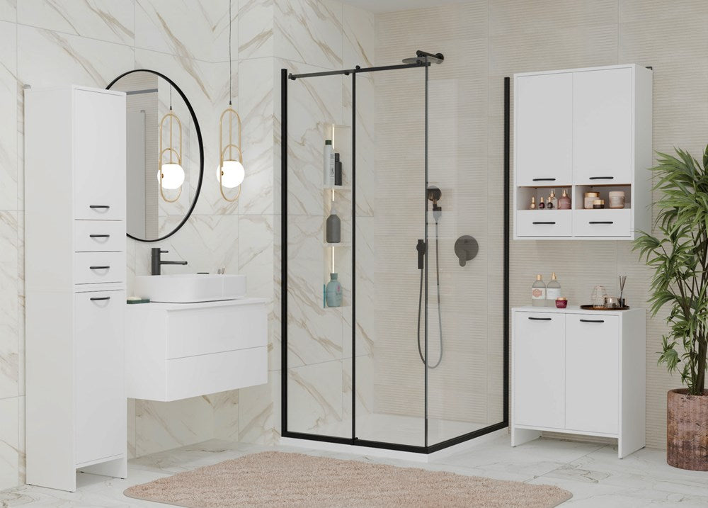 De NINA W1D2S badkamer hangkast combineert praktisch design met een moderne uitstraling. Dankzij het compacte formaat en de functionele indeling is deze kast ideaal voor zowel kleine als ruime badkamers. Bovenin vind je drie royale planken achter een deur, perfect voor je cosmetica, handdoeken en schoonmaakmiddelen. Onderaan beschikt de kast over twee ruime lades op soepele rolgeleiders. De matwitte afwerking in combinatie met stijlvolle zwarte handgrepen zorgt voor een tijdloze look die in elk badkamerinterieur past.