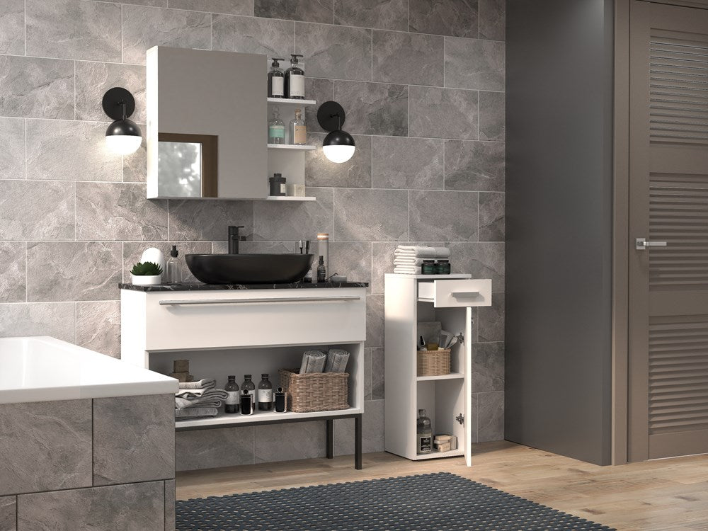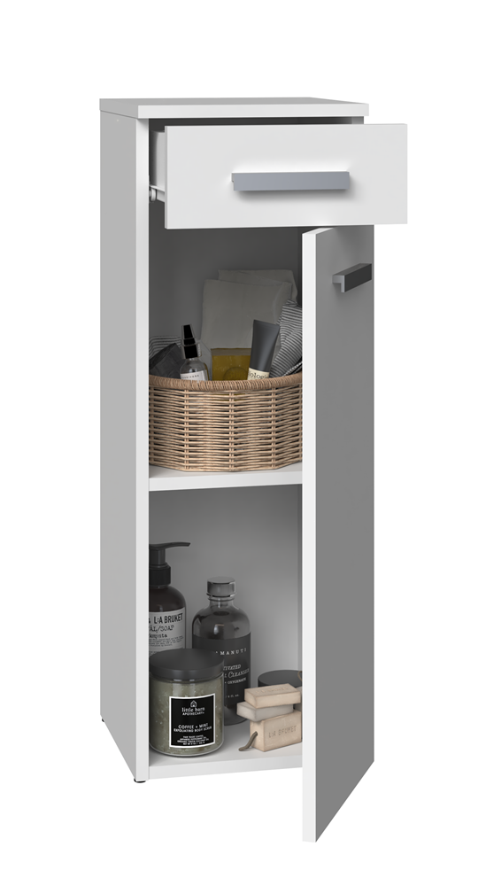 Ontdek de stijlvolle en functionele NEL V DS badkamerkast in mat wit. Dit model is uitgerust met een praktische lade en een ruime deur, waarmee u eenvoudig al uw badkamerbenodigdheden overzichtelijk opbergt. Dankzij het compacte formaat neemt de kast weinig ruimte in, terwijl de strakke afwerking en universele uitstraling naadloos aansluiten op elk interieur. De hoogwaardige lade- en deurgrepen zorgen daarbij voor gemakkelijk gebruiksgemak en geven het meubel een elegant accent.