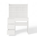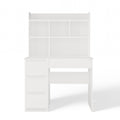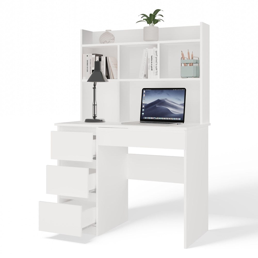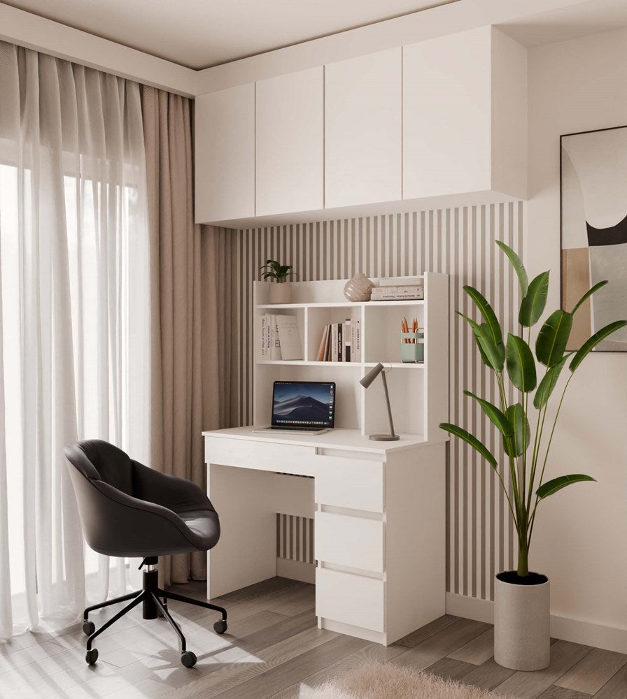 Het MIJAS bureau met linker-uitbreiding in mat wit is de ideale keuze voor wie een comfortabele en stijlvolle werk- of studieruimte zoekt. Dankzij het geïntegreerde aanbouwelement beschik je over open planken voor boeken en accessoires, drie ruime lades links voor documenten en één handige lade rechts voor kleine items. Het brede werkblad biedt voldoende ruimte voor je studie, laptop of creatieve projecten, terwijl de ergonomische beenruimte zorgt voor langdurig zitcomfort. De moderne, neutrale uitstraling maakt het bureau geschikt voor zowel kinder- en tienerkamers als een thuiskantoor.
