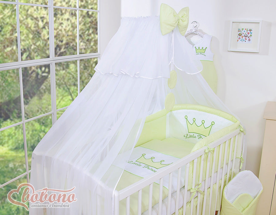 Groot klamboe voor babybedje van wit chiffon met cirkels en strik - groene ophanghaken
