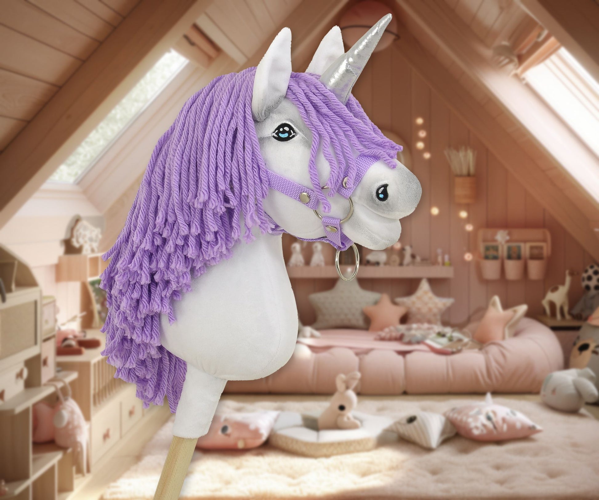 Super Hobby Horse - Prachtige witte eenhoorn op stok, voorzien van lange, zachte lila manen, perfect om de mooiste kapsels mee te maken. De zilveren, glanzende hoorn maakt het plaatje compleet.