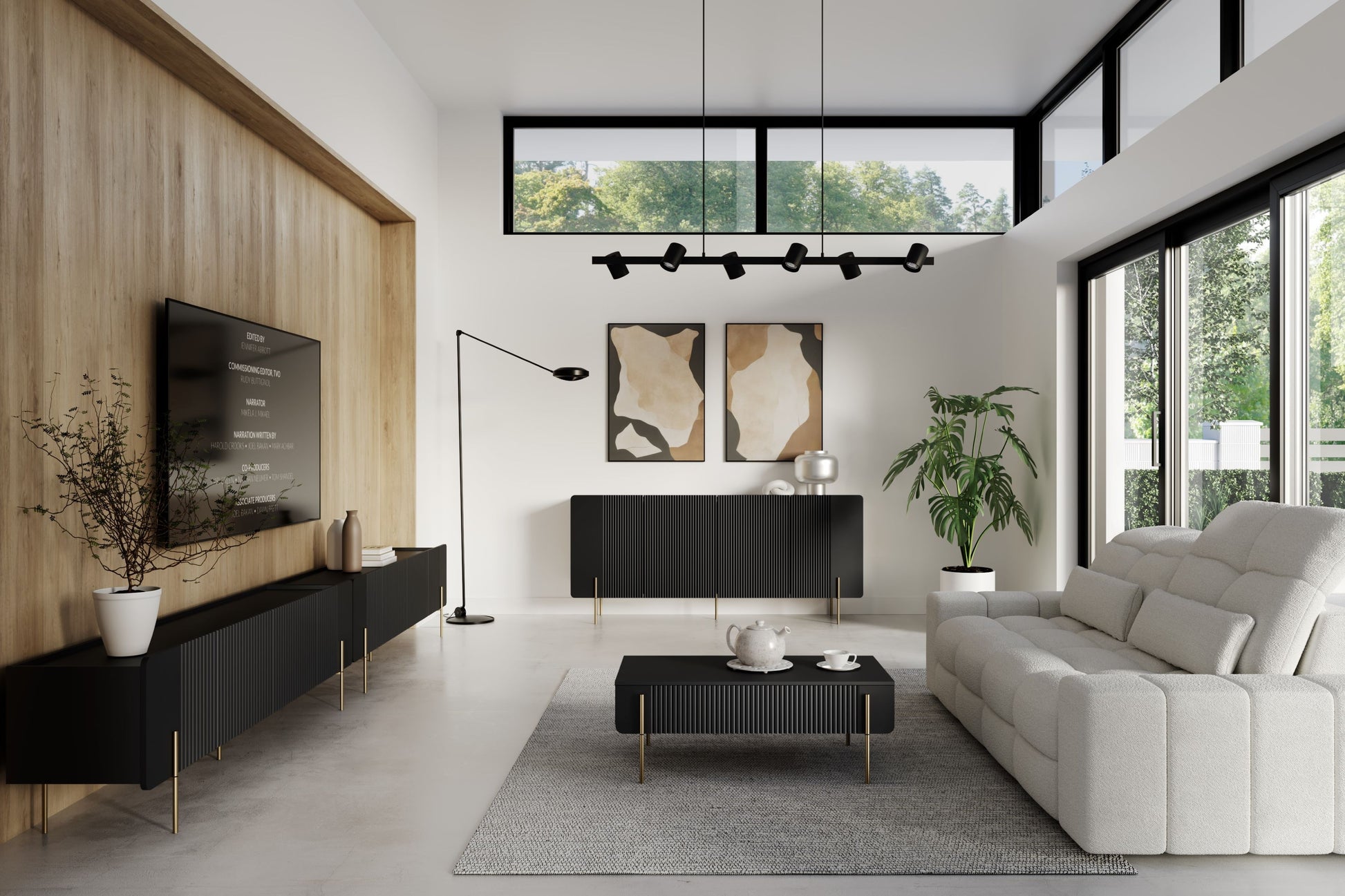 Het Malmi TV-meubel 200 cm in mat zwart met gouden poten brengt pure elegantie en moderniteit in jouw woonkamer. Dit stijlvolle meubelstuk is voorzien van geribbelde, handgreeploze fronten, afgeronde hoeken en een diepe, matte afwerking. Opvallende gouden, gepoedercoate metalen poten zorgen voor een chique uitstraling, terwijl de solide romp en duurzame MDF-fronten garant staan voor jarenlang gebruiksplezier. Het meubel is ontworpen met oog voor detail, en tilt iedere moderne, loft- of glamwoonkamer moeiteloos naar een hoger niveau.