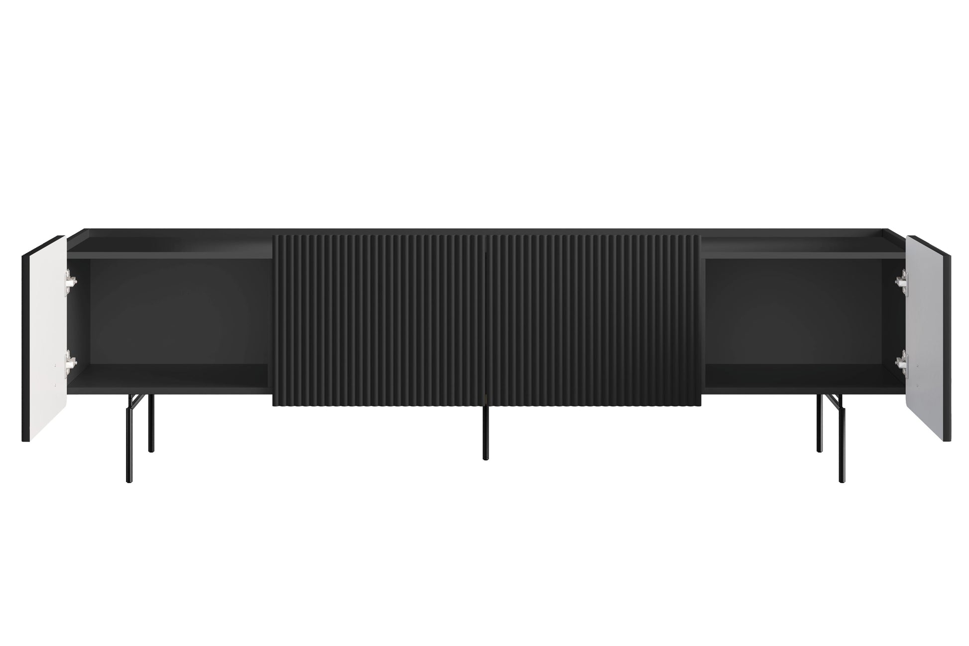 Het Malmi TV-meubel 200 cm in mat zwart straalt moderne elegantie uit en is een echte blikvanger in elke woonkamer. Het minimalistische ontwerp, de gegroefde fronten van 18 mm MDF en de afgeronde randen zorgen voor een eigentijdse look met een zachte touch. Het meubel is voorzien van stevige, slanke metalen poten en een solide kast van 16 mm dik gelamineerd karton voor optimale duurzaamheid. Dankzij de matte finish, het kabelgat en de greeploze afwerking past dit meubel perfect bij moderne, loft- en minimalistische interieurs.
