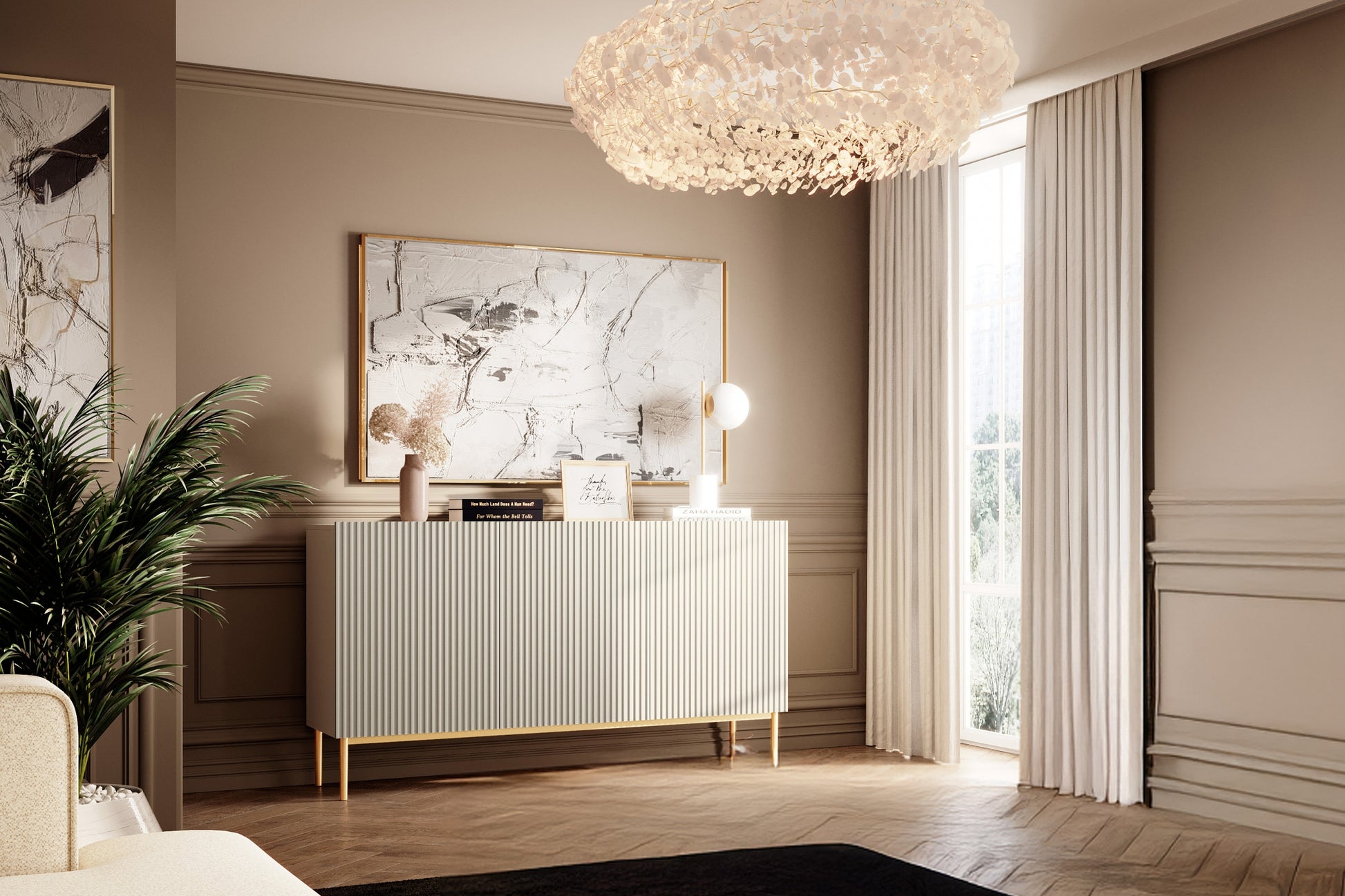 Nicole ladekast 150 cm 3-deurs gegroefd front soft-close | Kasjmier | Gouden poten