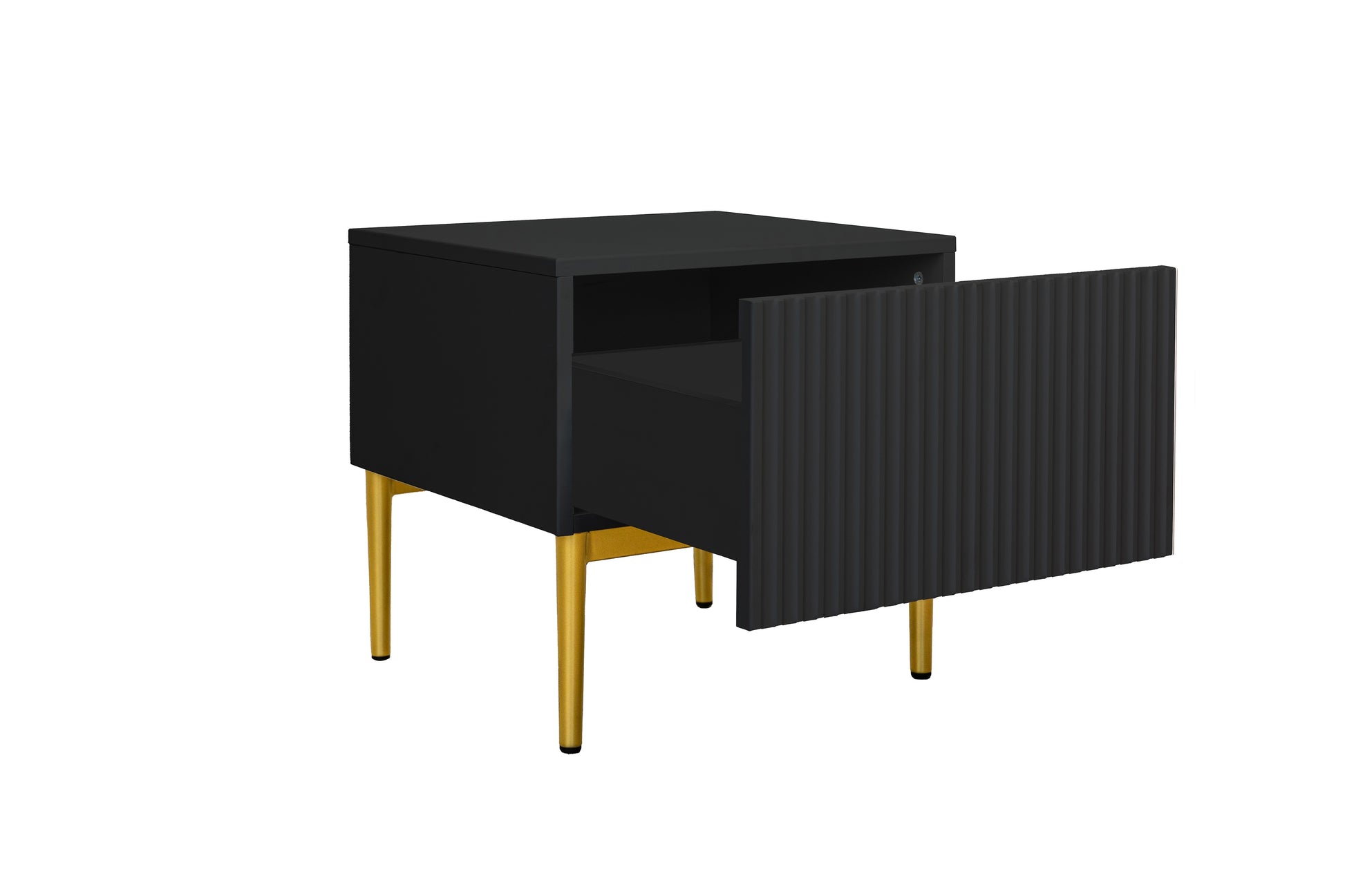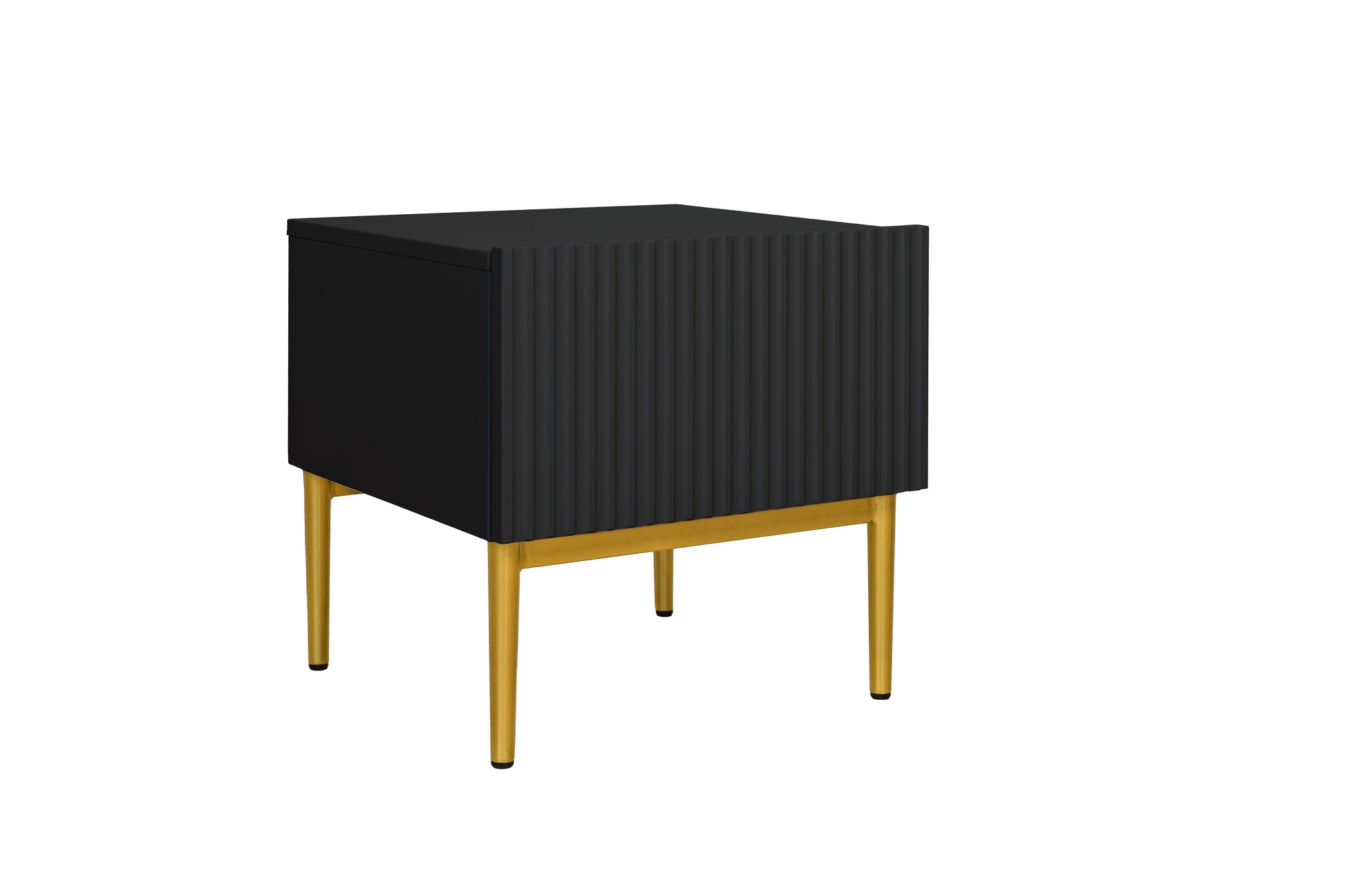 Breng een vleugje luxe in uw slaapkamer met de Nicole nachtkastjeset van 46 cm in matzwart met goudkleurige metalen poten. Deze set van twee nachtkastjes combineert een modern ontwerp met verfijnde details zoals geribbelde fronten en elegante gouden accenten. De stevige constructie van 18 mm MDF en metalen poten met rubberen pads zorgen voor duurzaamheid én stabiliteit. Dankzij de ruime lade met geruisloze sluiting heeft u alles wat u nodig heeft binnen handbereik, terwijl uw interieur een frisse, stijlvolle uitstraling krijgt.