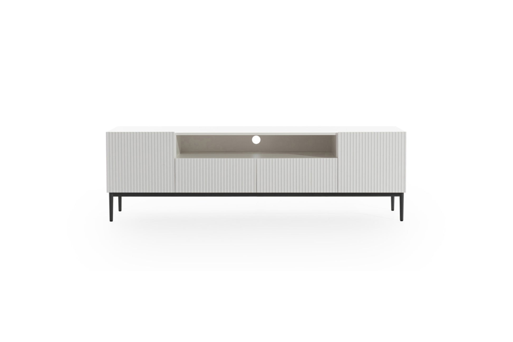 Geef uw woonkamer een moderne uitstraling met het Nicole TV-meubel van 200 cm. Dit stijlvolle meubel combineert een matwitte body met elegante zwarte poten en een minimalistisch design, perfect passend bij hedendaagse interieurs. Het meubel is vervaardigd van gelamineerd karton en MDF-front en beschikt over twee ruime lades, twee planken en een handige nis voor uw apparatuur of decoraties. De stille scharnieren zorgen voor geruisloos openen en sluiten. Dit TV-meubel biedt niet alleen een verfijnde uitstraling, maar garandeert ook praktische opbergruimte.