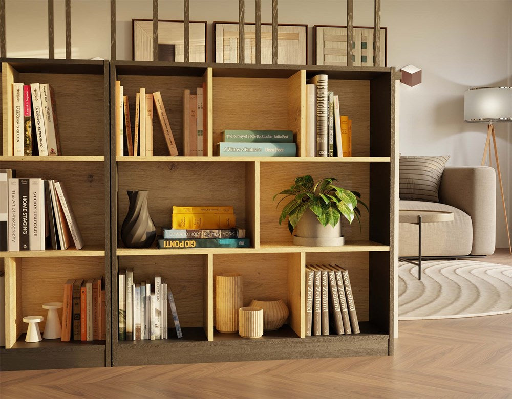De FIESTA 8P boekenkast is een stijlvol, modern meubelstuk dat uitermate geschikt is voor liefhebbers van Scandinavisch design. Dankzij het open ontwerp biedt deze kast eenvoudig toegang tot al uw boeken, decoraties en accessoires. De combinatie van diep antraciet met warm artisan eikenhout zorgt voor een eigentijdse uitstraling die perfect past in elk modern interieur. Met acht ruime vakken kunt u gemakkelijk uw ruimte netjes en overzichtelijk houden, zelfs in kleinere kamers zoals de slaapkamer, kinderkamer of het thuiskantoor.