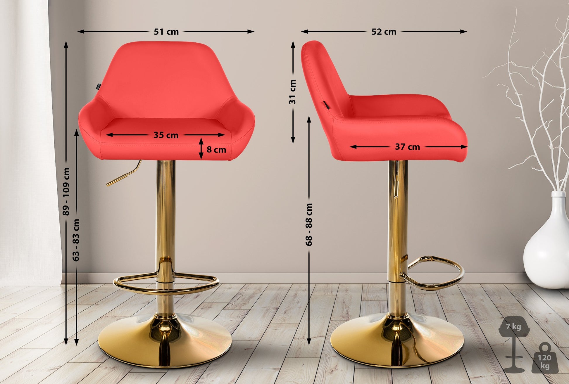 Deze barkrukken hebben een elegant ontwerp met een goudkleurig metalen frame, waardoor ze perfect zijn voor de keuken, eetkamer, woonkamer of thuisbar. De hoogwaardige kunstleren bekleding van de zitting en rugleuning zorgt voor optimaal comfort, ondersteund door een geïntegreerde voetensteun. De zithoogte is traploos verstelbaar dankzij een gaslift en de zitting kan 360 graden draaien voor extra flexibiliteit.