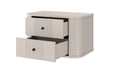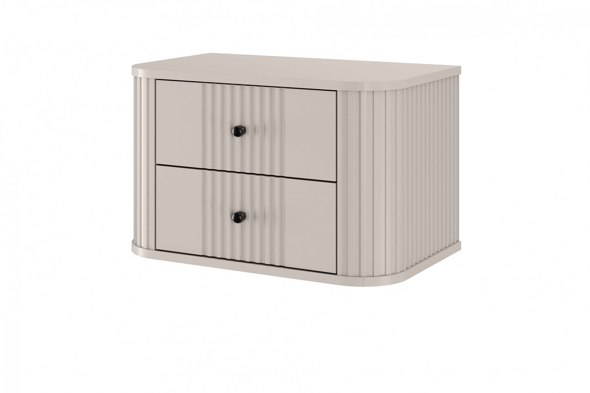 Maak jouw slaapkamer compleet met de Set Vesper hangende nachtkastjes van 56 cm in kasjmier met stijlvolle zwarte handgrepen. Het moderne ontwerp met geribbelde MDF-fronten, elegante afgeronde randen en zwevend effect geeft een luxueuze uitstraling aan elke ruimte. Dankzij de robuuste constructie uit gelamineerd board en 16 mm dik MDF geniet je jarenlang van duurzaamheid en gebruiksgemak. De nachtkastjes beschikken over twee ruime lades met soft-close mechanisme, waardoor je al jouw essentials netjes en geruisloos opbergt. De subtiele kasjmierkleur vormt een perfecte aanvulling op moderne, Scandinavische of klassieke interieurs.