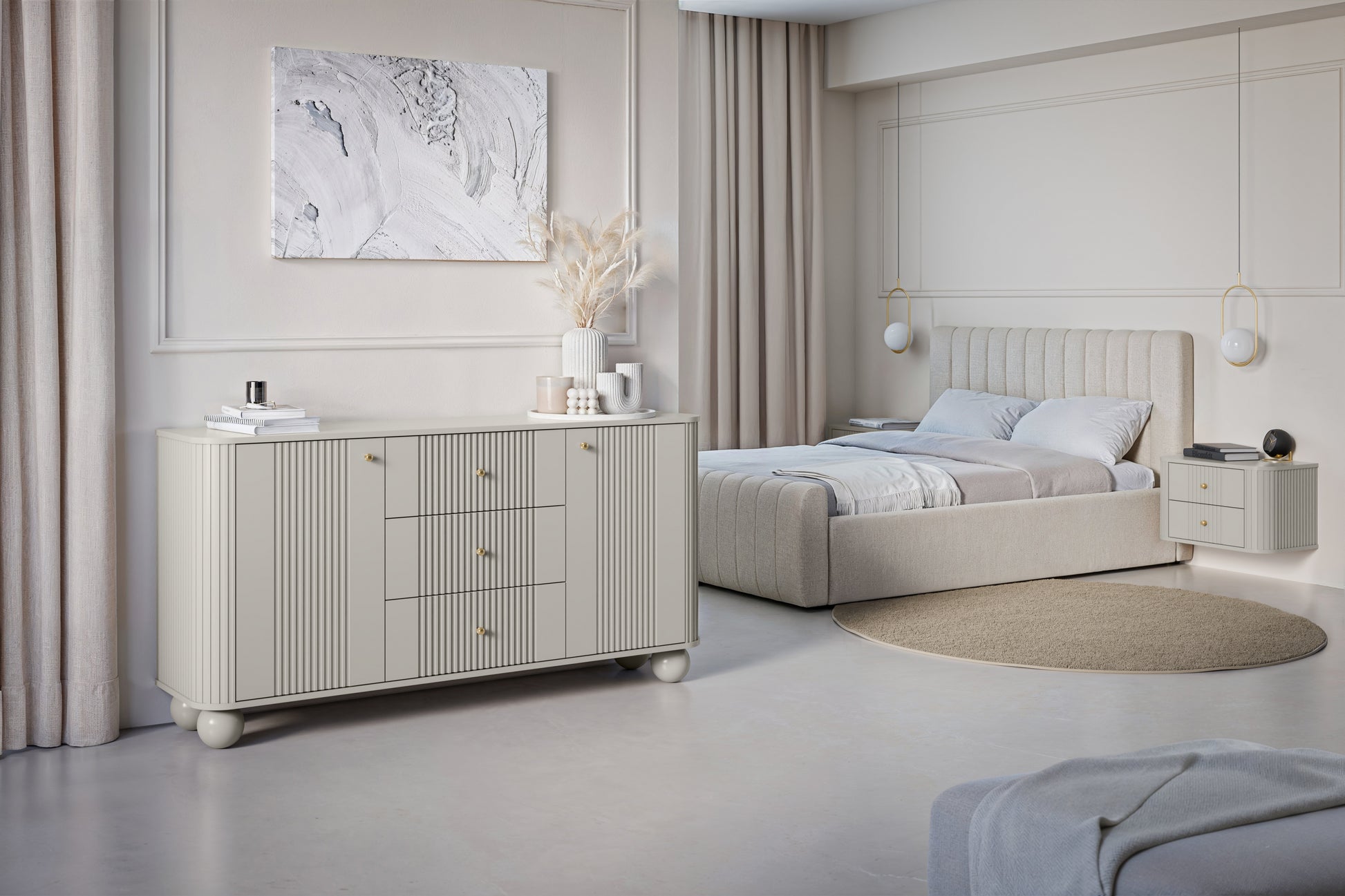 De Vesper hangende nachtkastjes zijn perfect voor kleine én grote slaapkamers, want het zwevende ontwerp vergroot optisch de ruimte en maakt schoonmaken eenvoudiger. De stevige ABS-randen beschermen tegen stoten, terwijl de metalen, goudkleurige handgrepen een glamoureus accent toevoegen. Dankzij het moderne en tijdloze design past deze set uitstekend in minimalistische, glamoureuze en eigentijdse interieurs. Combineer met lichte muren of gouden accessoires voor een harmonieuze en samenhangende slaapkamer.