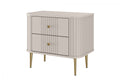 Breng elegantie in je slaapkamer met de Vesper nachtkastjeset van 56 cm in kasjmierkleur met gouden poten. De combinatie van subtiel kasjmier met luxe gouden accenten creëert een tijdloze uitstraling, terwijl de geribbelde fronten en afgeronde randen de set een designvol karakter geven. De nachtkastjes bieden dankzij hun compacte formaat ruimtebesparing zonder in te leveren op stijl, en passen perfect naast elk bed. Met het stijlvolle duo voeg je niet alleen een blikvanger toe aan je slaapkamer, maar ook praktische opbergruimte voor je nachtrustbenodigdheden.